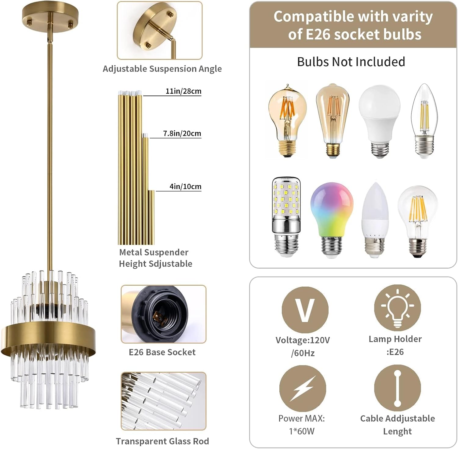 - Estable y duradero: El chasis de metal grueso hace que la instalación de lámparas sea más estable y tiene una vida útil más larga. El tirantes de metal conectado entre sí a través de roscas (hasta 59 pulgadas de longitud) le permite adaptarse a tus escenarios de uso. Con una foco base E26 común (sin incluir la foco), hasta 60 W