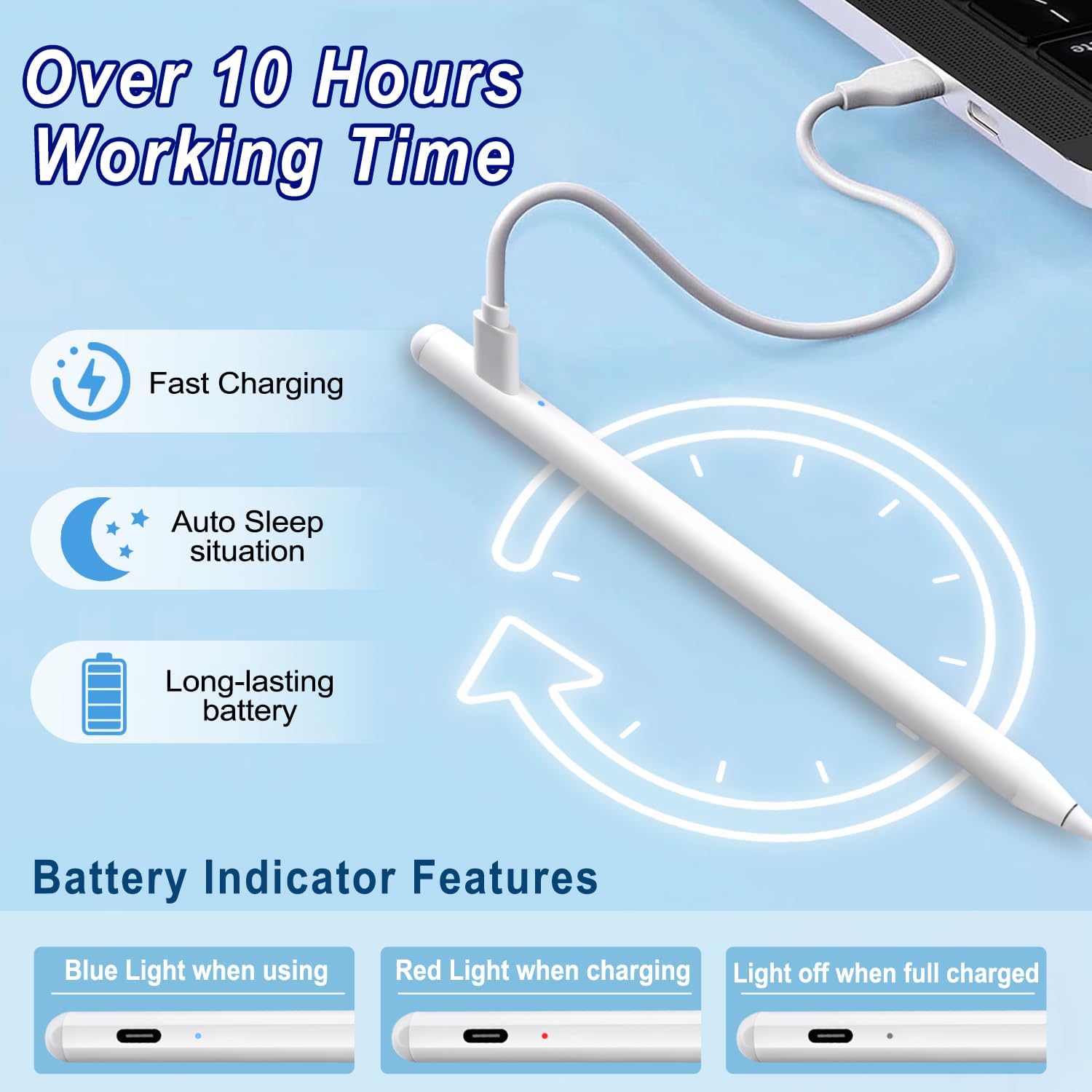 - Batería de larga duración y carga rápida: alimentado por una batería eficiente, este lápiz óptico ofrece hasta 10 horas de uso continuo con una sola carga, por lo que es perfecto para sesiones de trabajo prolongadas. Cuando la batería está baja, la función de carga rápida le permite recargar rápidamente. Para encender el bolígrafo, simplemente haga doble clic en él si está seguro de que tiene energía. Para ahorrar energía, el bolígrafo se desconectará automáticamente y entrará en modo de suspensión después de 10 minutos de inactividad. Puede reiniciarlo fácilmente volviendo a encender el bolígrafo.