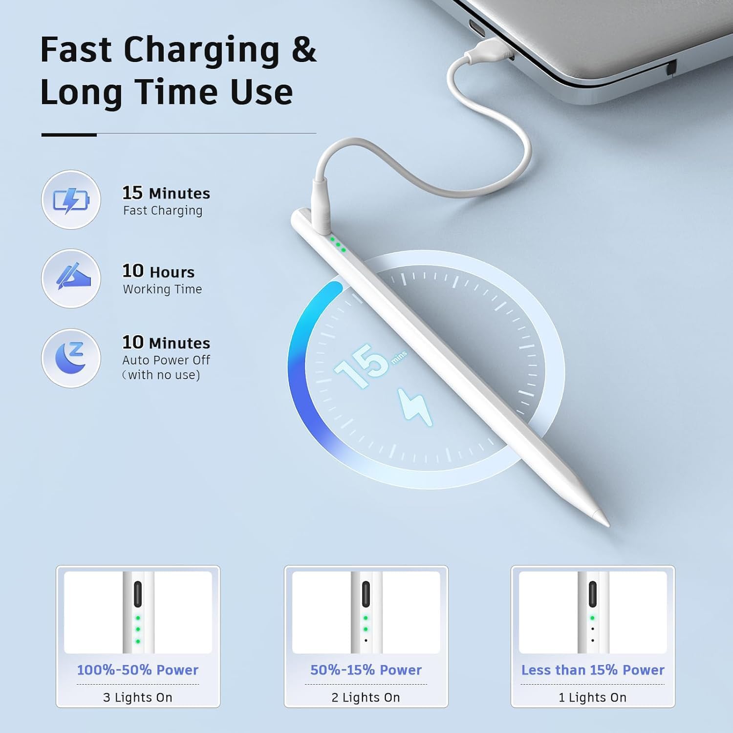 - Diseño de carga rápida y apagado automático: 15 minutos completamente cargado con cable tipo C, soporta 10 horas de uso continuo. Además, el lápiz iPad se apagará automáticamente después de 10 minutos de inactividad, ahorrando energía efectivamente y extendiendo la duración de la batería.