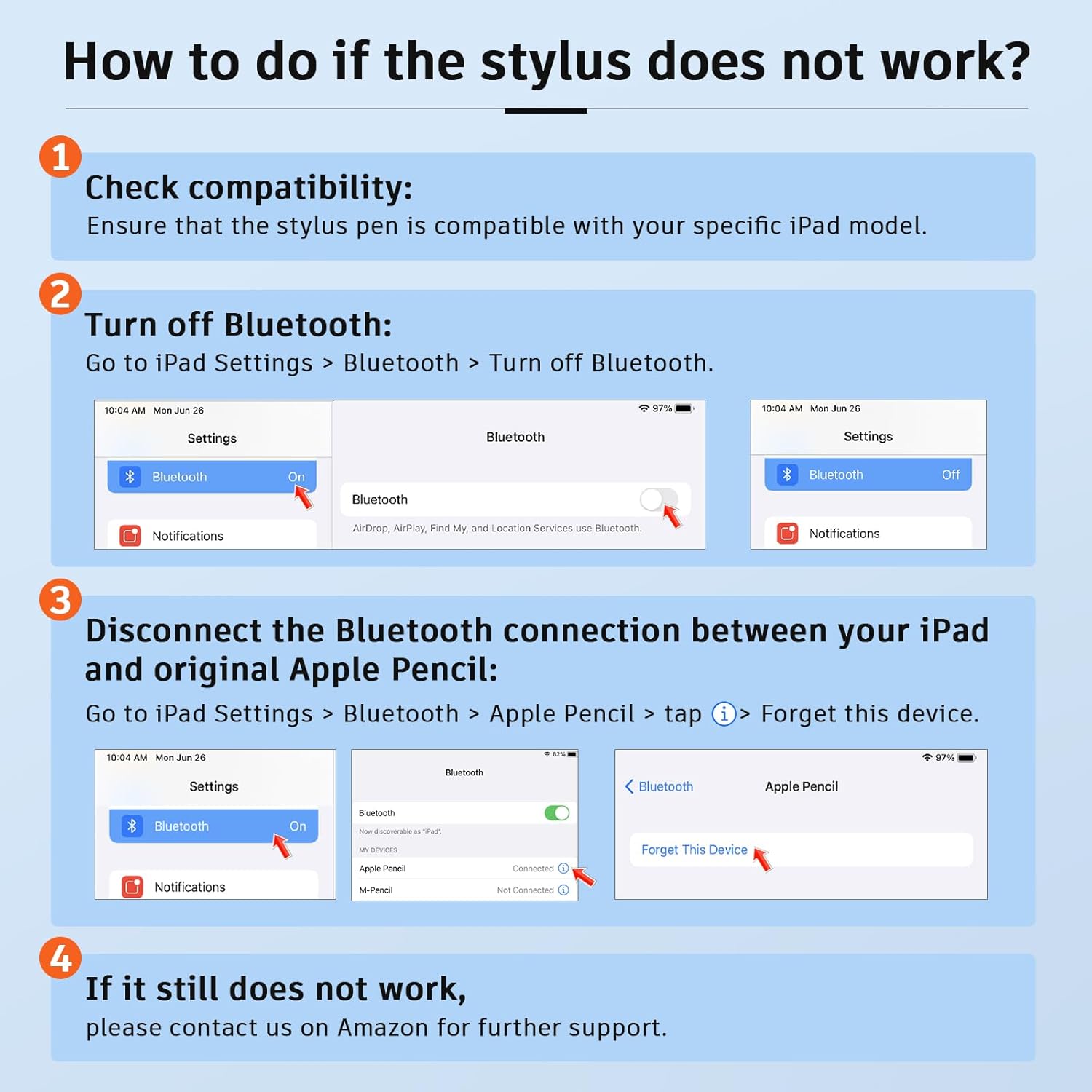 - Encendido/apagado: enciende y apaga este lápiz óptico simplemente presionando el botón de tapa, sin necesidad de conexión Bluetooth. (Consejos: si descubre que no funciona después de encenderlo, desconecte primero la conexión Bluetooth entre su Apple Pencil original y el iPad: Configuración > Bluetooth > Apple Pencil > toque "i" > Olvídate de este dispositivo).
