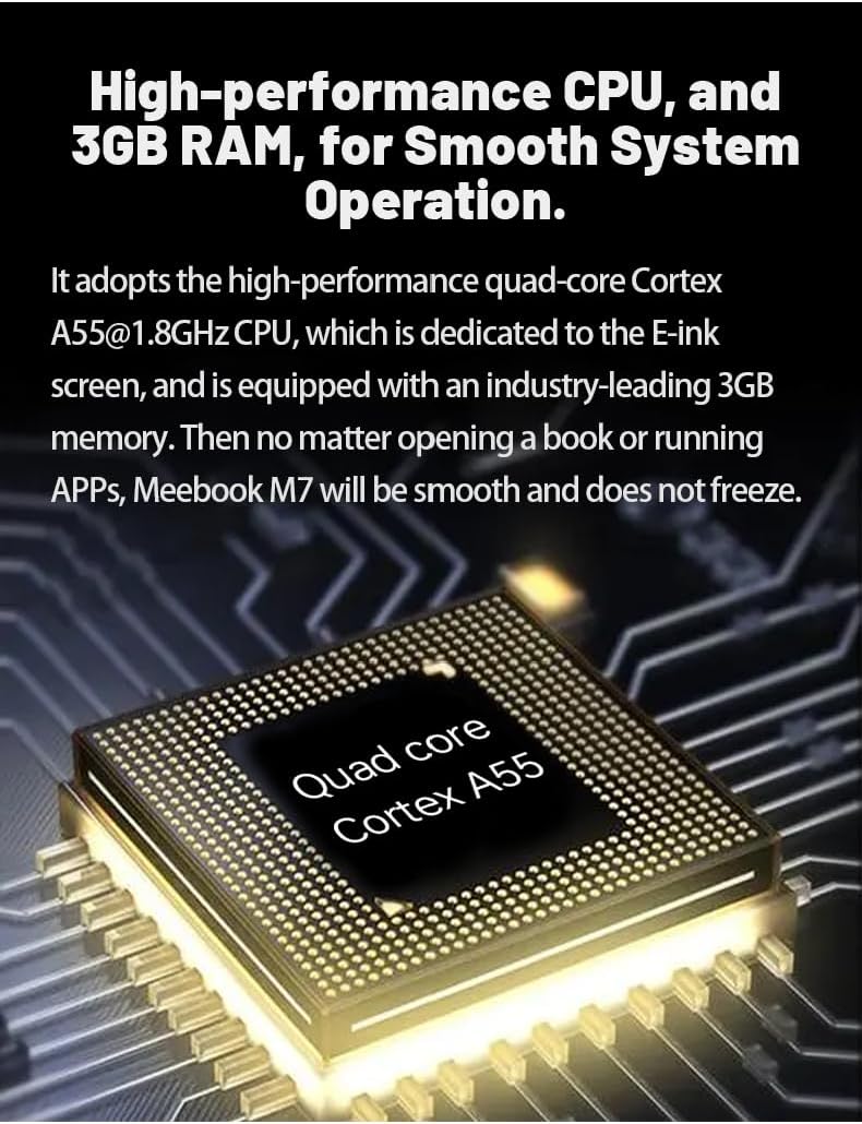 - Android 11: sistema Android abierto para la instalación de más aplicaciones de terceros, abundantes recursos de lectura disponibles. Procesador A55 Quad Core de alto rendimiento para un funcionamiento suave del sistema. 3 GB de RAM + 32 GB de memoria, compatible con tarjeta TF de hasta 1 TB, almacenamiento de más de 20000 libros.