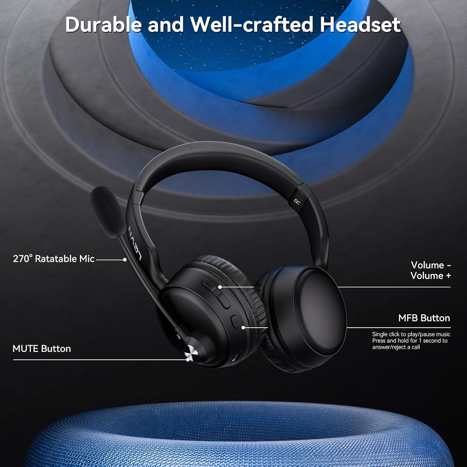 - Comodidad durante todo el día: diseñados para la máxima comodidad, los auriculares Bluetooth con micrófono cuentan con almohadillas para orejas de espuma viscoelástica que se ajustan suavemente a tus oídos, la diadema ajustable y el micrófono giratorio de 270° proporcionan un ajuste personalizado, reduciendo la fatiga durante largas sesiones de escucha. Ya sea que estés trabajando durante horas o disfrutando de tu lista de reproducción favorita, este auricular inalámbrico con micrófono combina comodidad ergonómica con funcionalidad práctica para una experiencia relajante y eficiente.