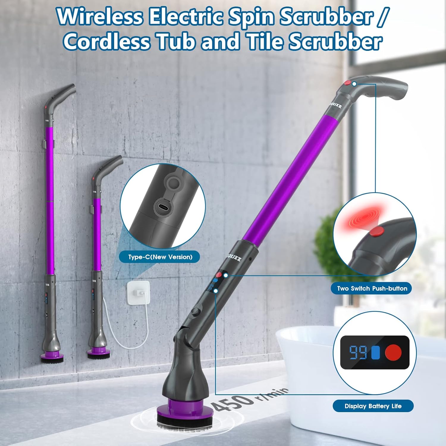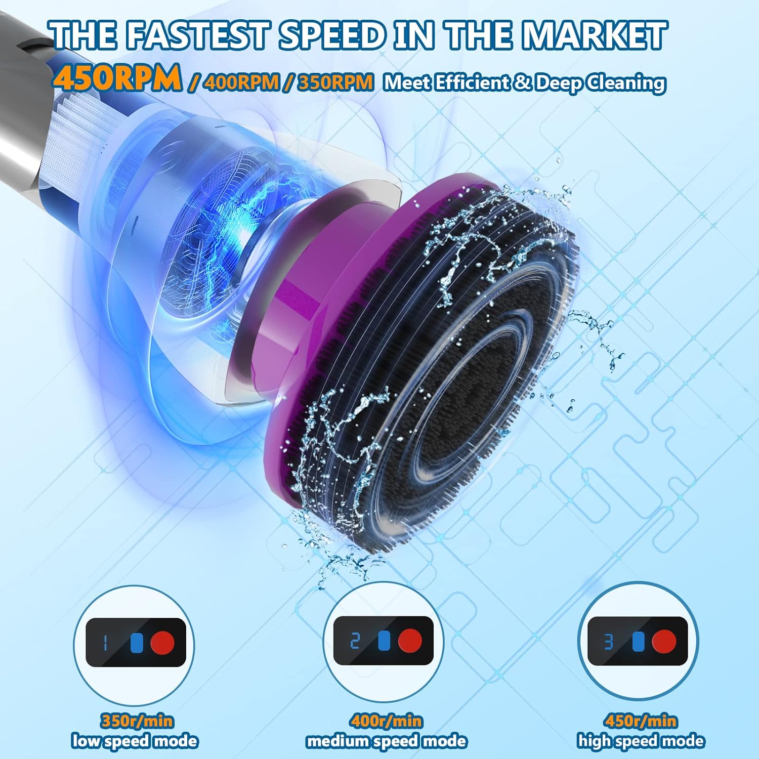 - La velocidad más alta del mercado. El limpiador giratorio eléctrico mejorado tiene 3 velocidades de trabajo, ①Velocidad baja: 350 r/min; ②Velocidad media: 400 r/min; Alta velocidad: 450 r/min; lo que significa más limpio y eficaz, mientras que hace que tu trabajo de limpieza sea más fácil. Todo lo que solo tienes que hacer es pulsar el botón ON/OFF una vez, y cuando se utiliza con un agente de limpieza, puede limpiar rápidamente las manchas difíciles y el cepillo de limpieza inalámbrico hacen que cada superficie del baño de tu casa brille.