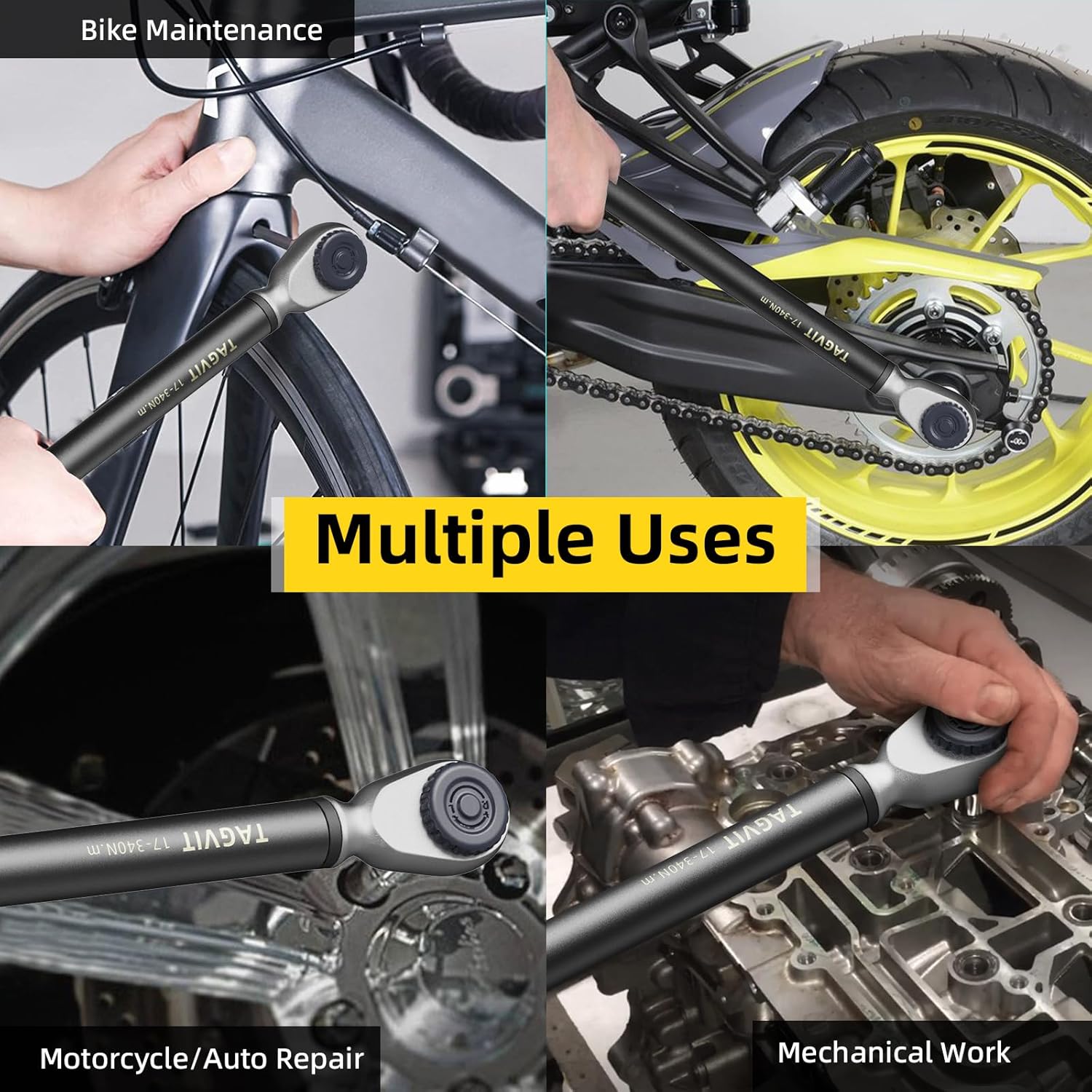 - Cuatro unidades de medición de torsión: el rango de torsión de la llave dinamométrica digital es de 17-340 Nm, con cuatro unidades de torsión diferentes: Nm, Ft.lb, In.lb, Kg. cm, que se puede cambiar rápidamente según sea necesario. La precisión es de ±2% en el sentido de las agujas del reloj y ±3% en sentido contrario a las agujas del reloj. Adopta una cabeza de carraca de 45 dientes fabricada profesionalmente, que tiene una mayor precisión en uso y no se desliza.