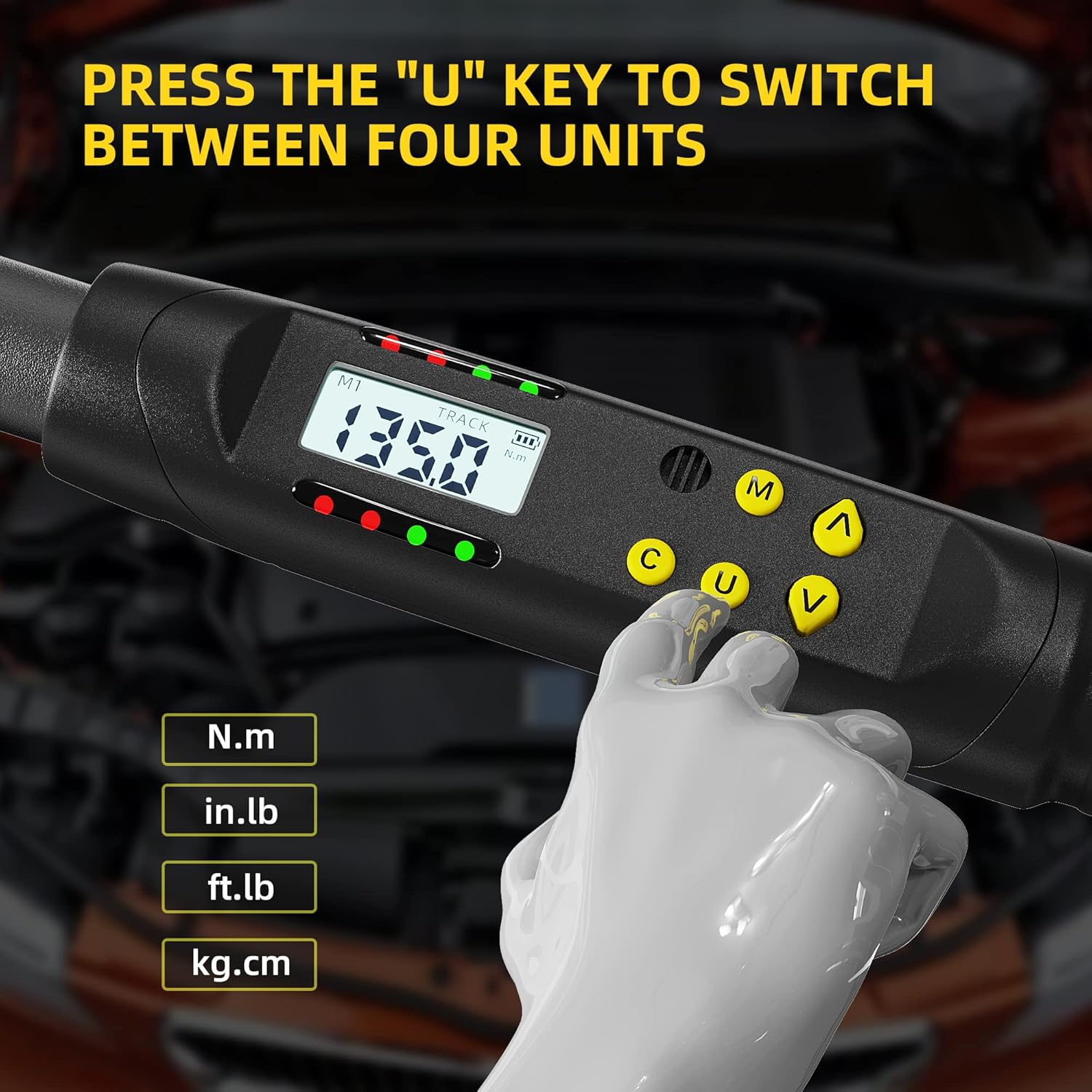 - 6 modos preestablecidos: Al ajustar el modo M1-M6 de la llave dinamométrica digital de 1/2 pulgadas, se pueden preajustar múltiples grupos de valores de par de uso común. Ideal para principiantes y profesionales, es ampliamente utilizado en bicicletas, motocicletas, reparación de automóviles y uso industrial, etc.