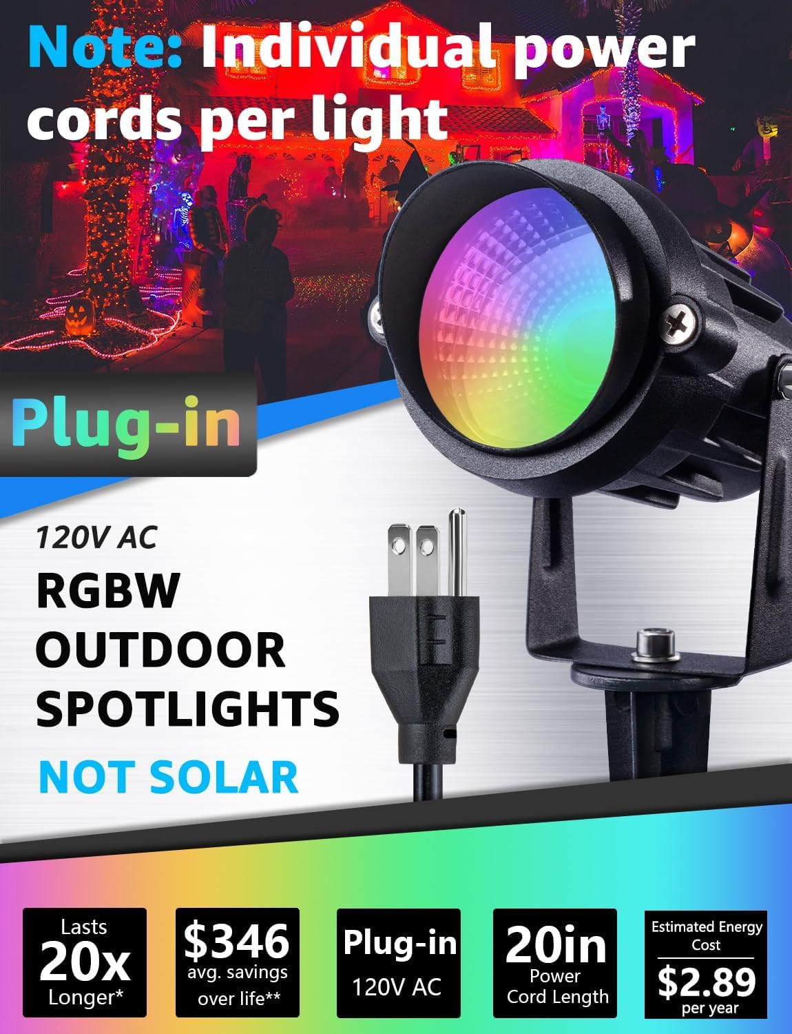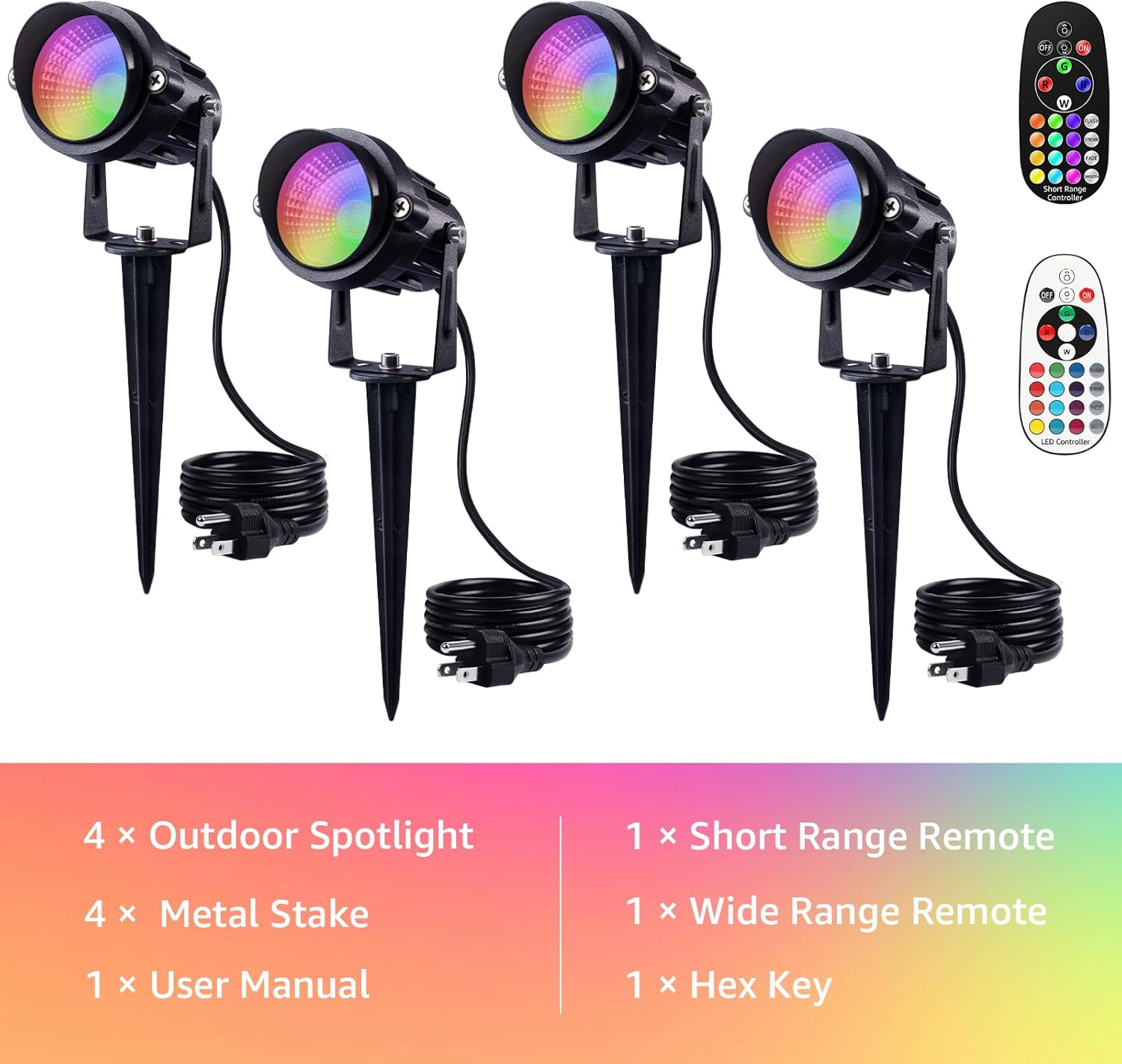 - Luces de paisaje que cambian de color con control remoto RF: paquete de 4 focos de paisaje RGBW de 12 W con carcasa de aluminio fundido a presión y estacas de metal. Incluye 1 control remoto de largo alcance y 1 control remoto de corto alcance, fácil de cambiar el color/modo de los focos. Decora perfectamente tu patio, árbol, casa, valla, boda, Navidad, Halloween.