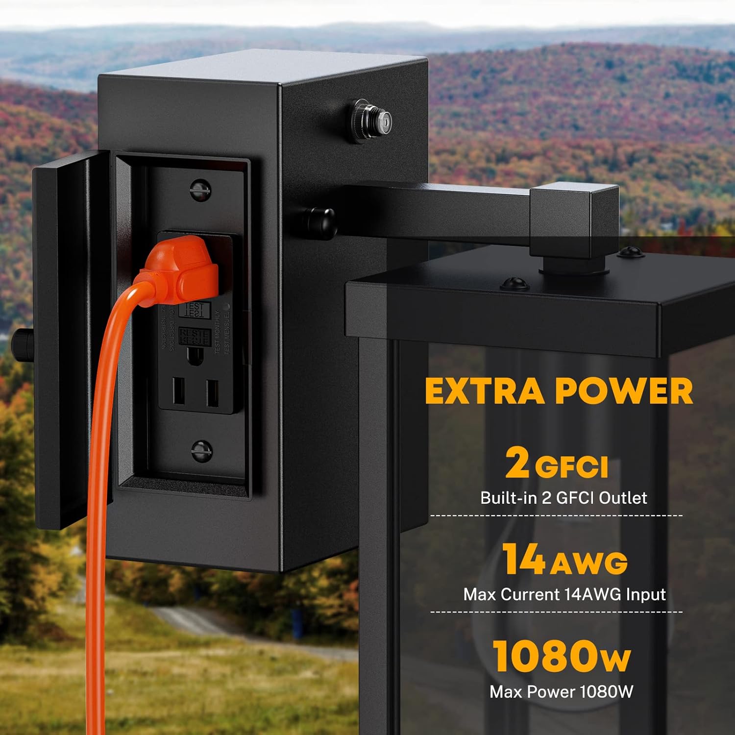 - 2 tomas de corriente incorporadas: las salidas GFCI (interruptor de circuito de falla a tierra) le brindan la comodidad de encender su energía al aire libre. Fácil acceso con protección adicional contra sobretensiones, cortocircuitos/otras fallas eléctricas. Simplemente enciende la luz y conecta tu decoración navideña, herramientas eléctricas, etc. Cable de entrada de 14 AWG con carga máxima de 1080 W.