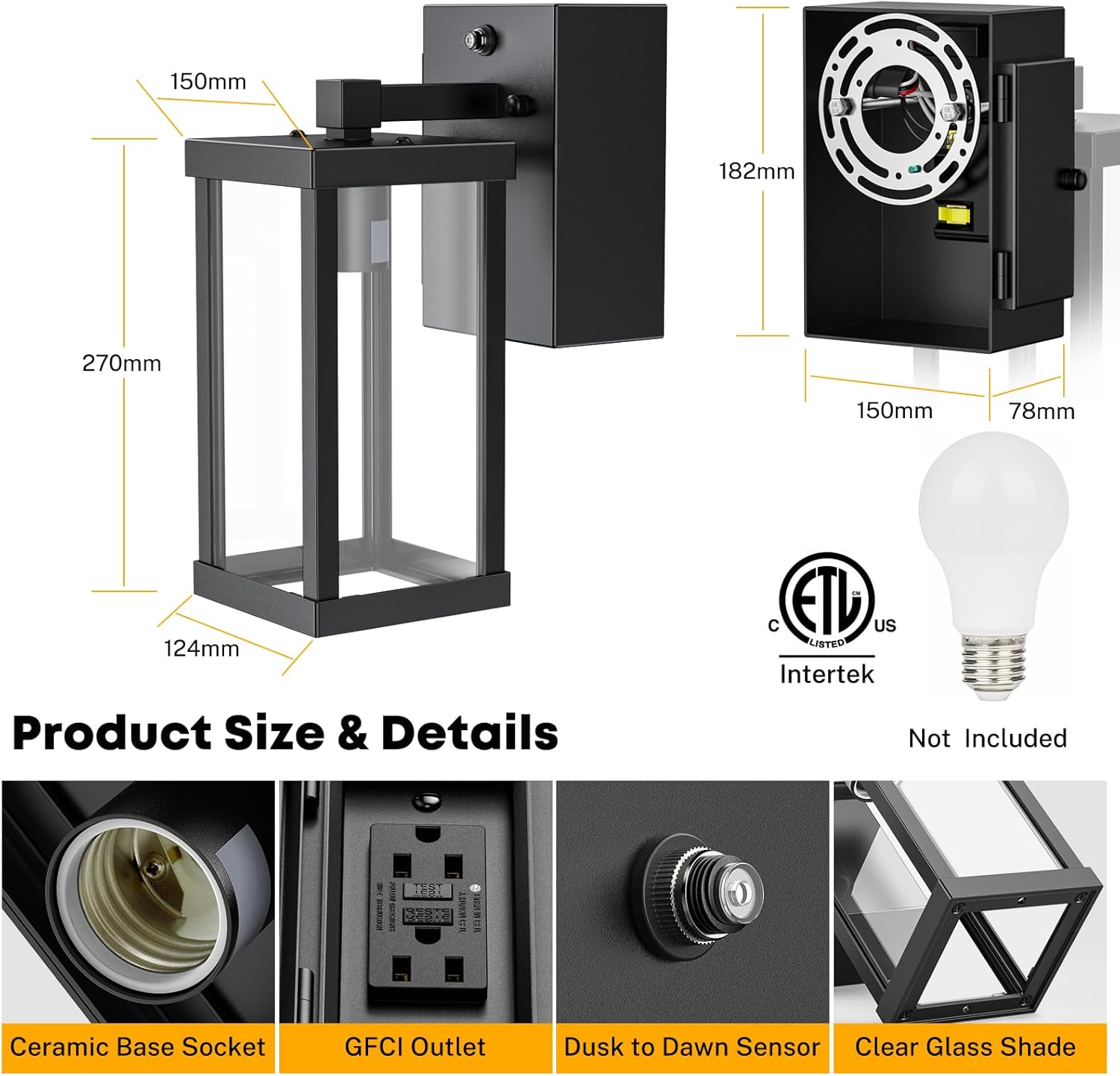 - Fácil instalación, seguridad y posventa: estas luces de garaje para exteriores están listadas por ETL, y todas las luces exteriores están premontadas, todo el hardware incluido en el paquete, simplemente monta las luces de aplique al aire libre en la pared. Recuerde presionar el botón "RESET 1" entre las tomas de corriente después de la instalación para restablecer los enchufes para su uso.