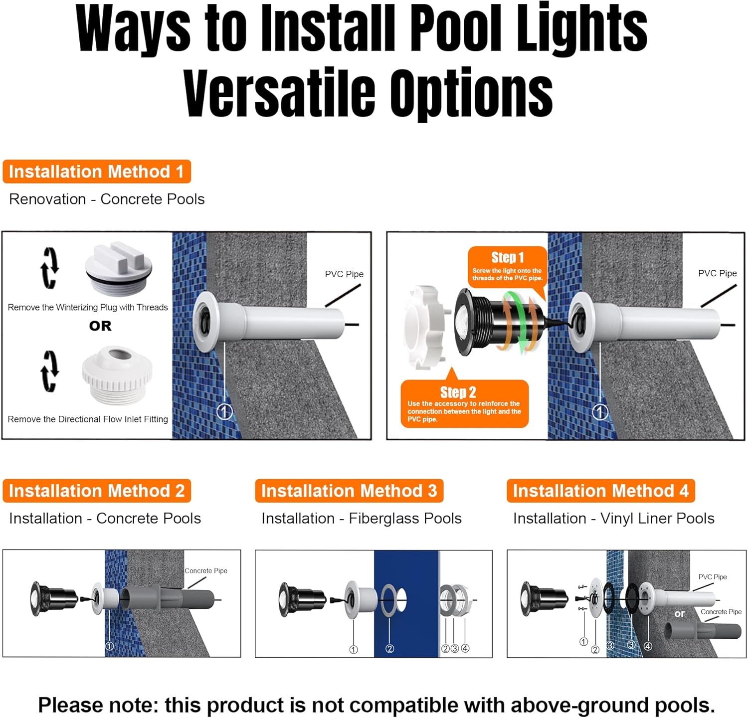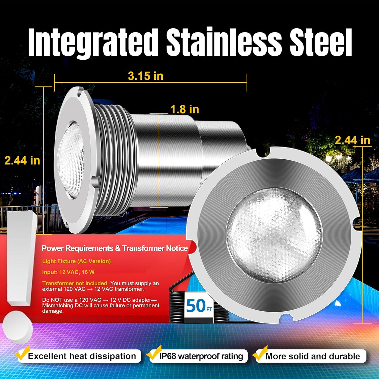 - Mejora tu piscina con nuestras luces de piscina sin nicheless de 1.5 pulgadas. Fabricadas con carcasa de acero inoxidable sin costuras y tecnología impermeable IP68 totalmente sellada, estas luces prometen durabilidad sin la molestia de los cambios anuales. Vienen con un cable de 50 pies para satisfacer diversas necesidades de cableado. Contiene 1 luz
