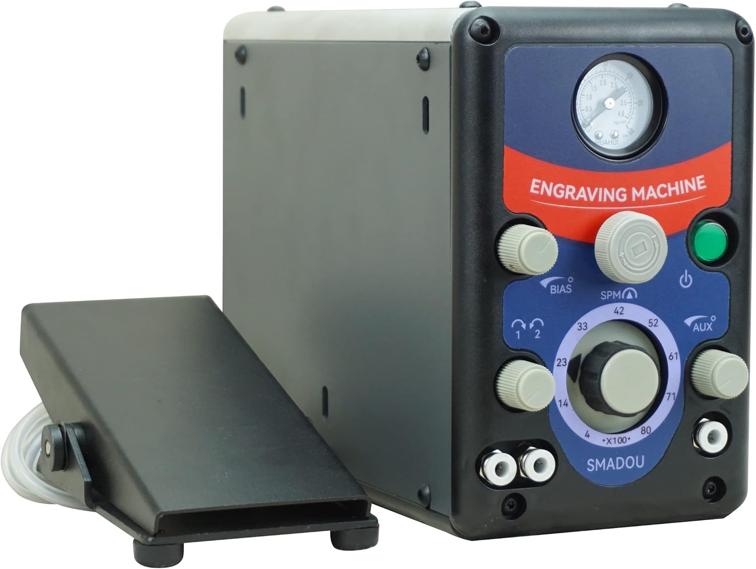 - Enciende la máquina de grabado neumático y establece el dial de trazo por minuto a 2300. Utilizando la perilla de control de presión en la parte delantera de la máquina, retrocede la presión de aire hasta 2 a 5 psi (0.1 a 0.4 bar).