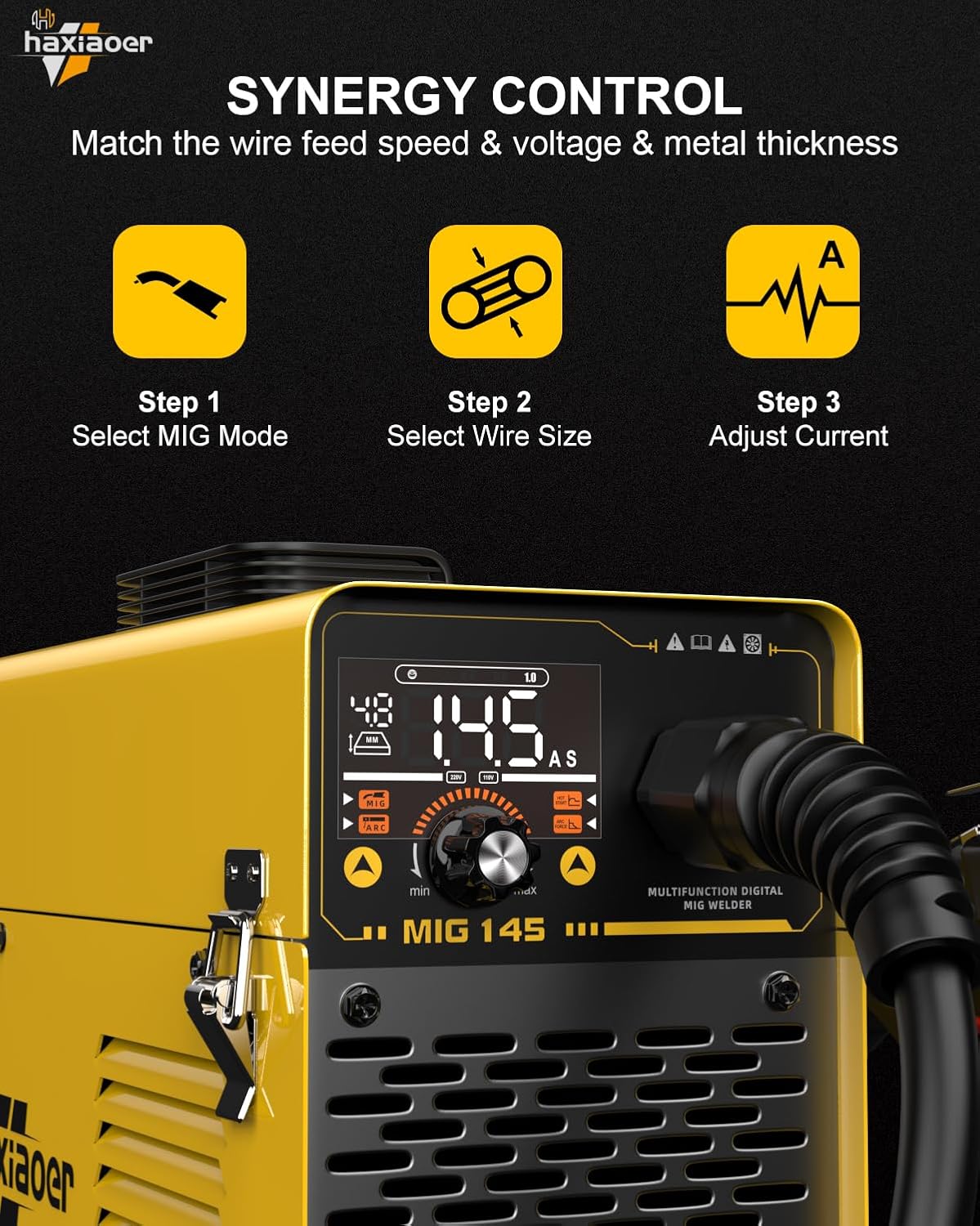 - Sistema de control fácil de usar: cuando cambias el grosor del cable (.030 pulgadas/.035 pulgadas/.040 pulgadas) o el amperaje, el sistema de control cooperativo inteligente haxiaoer mig ajusta automáticamente el voltaje y la velocidad de alimentación del cable. Esta característica aumenta la facilidad de uso y garantiza un rendimiento óptimo de soldadura para usuarios de todos los niveles de habilidad.