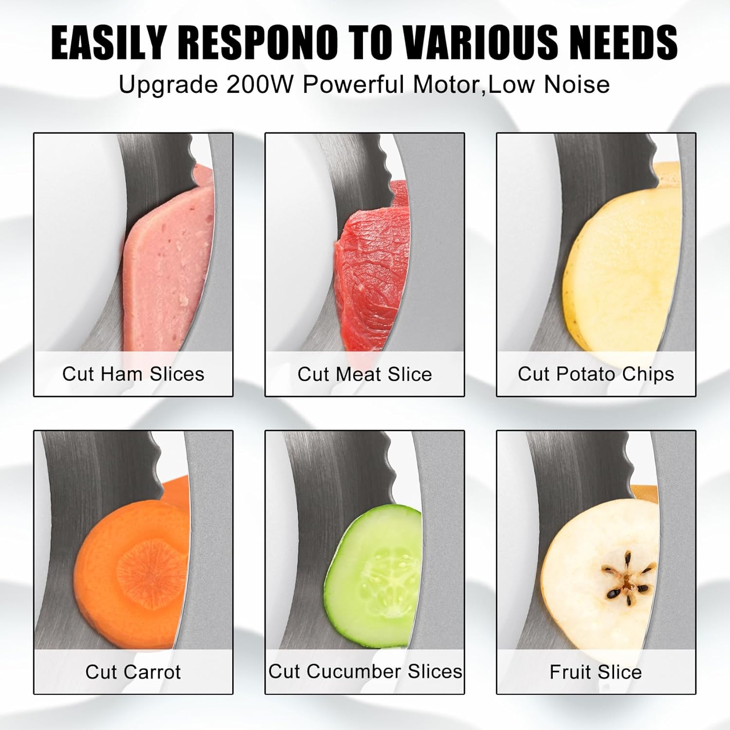 - Grosor ajustable: las cortadoras de alimentos CukAid ofrecen el rango de profundidad ajustable más amplio del mercado. Con el rango de grosor ajustable de 0.04 a 0.08 pulgadas, puedes elegir el grosor adecuado de las rodajas, la cortadora de carne recuerda no cortar carne congelada, descongelarla primero antes de cortarla. Es perfecto para rebanar cecina de ternera, sándwiches de delicatessen, embutidos, quesos duros, jamón, frutas, verduras y pan. Utilízalo para cortar rodajas de fruta deshidratadas, platos de fiesta, entremeses y más para hacer que tu cocina funcione más fácilmente.