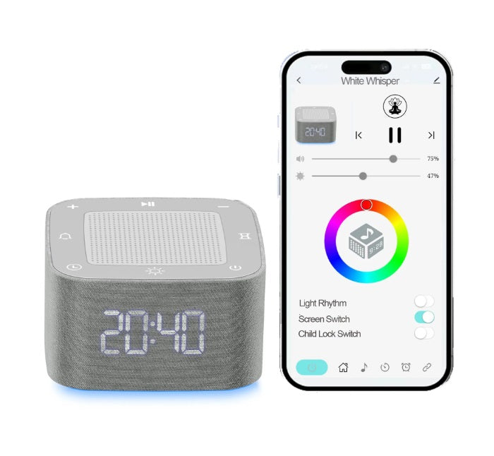 Es hora de un descanso o un entrenamiento. Enchufe la fuente de alimentación a nuestra máquina de ruido blanco y controle de forma remota a través de su teléfono. Personaliza tu horario de sueño/ejercicio, alarmas y temporizadores dentro de la aplicación. La aplicación permite la configuración personalizada de su propia rutina de ejercicio/sueño. Asegúrate de tener una conexión Wi-Fi y Bluetooth de 2.4G.