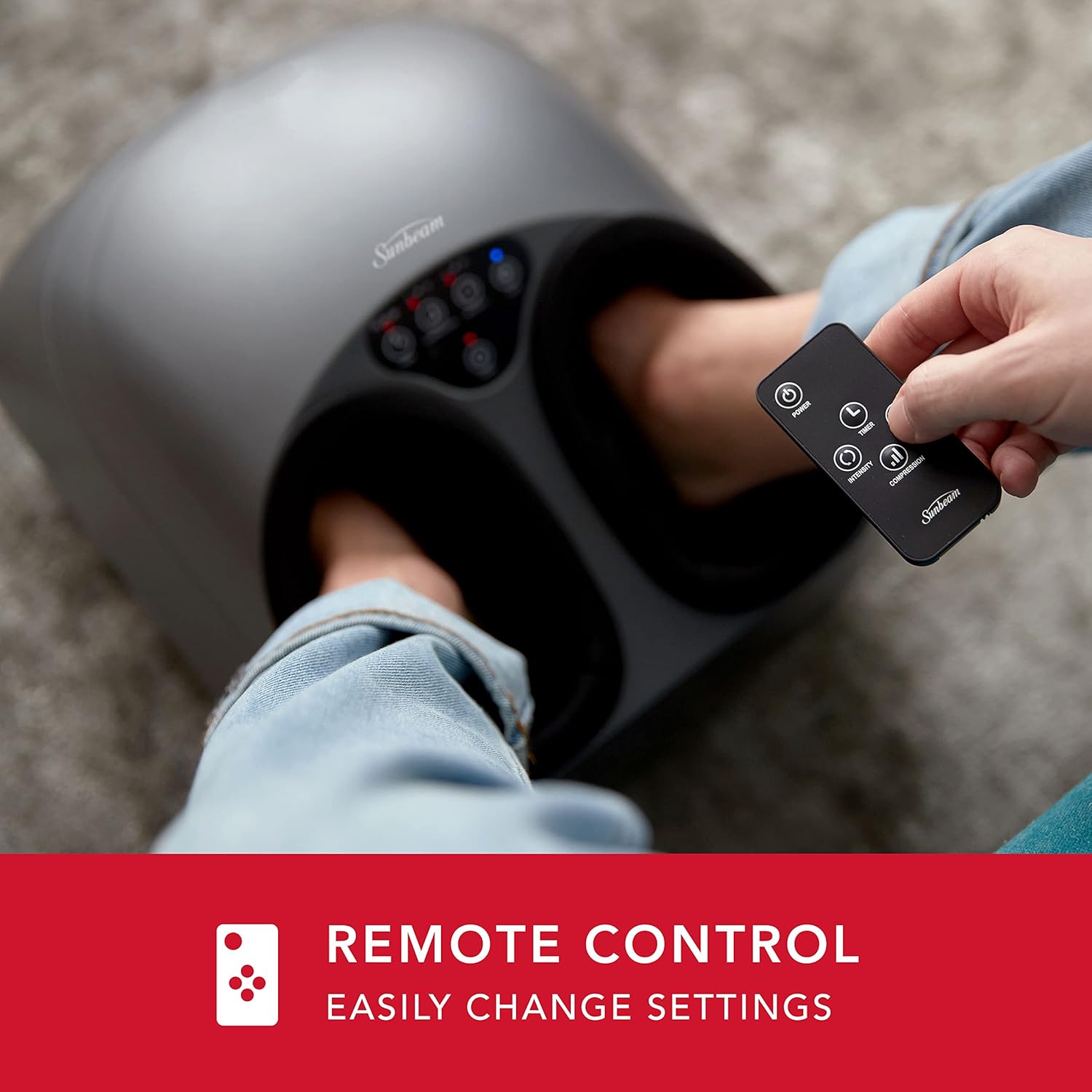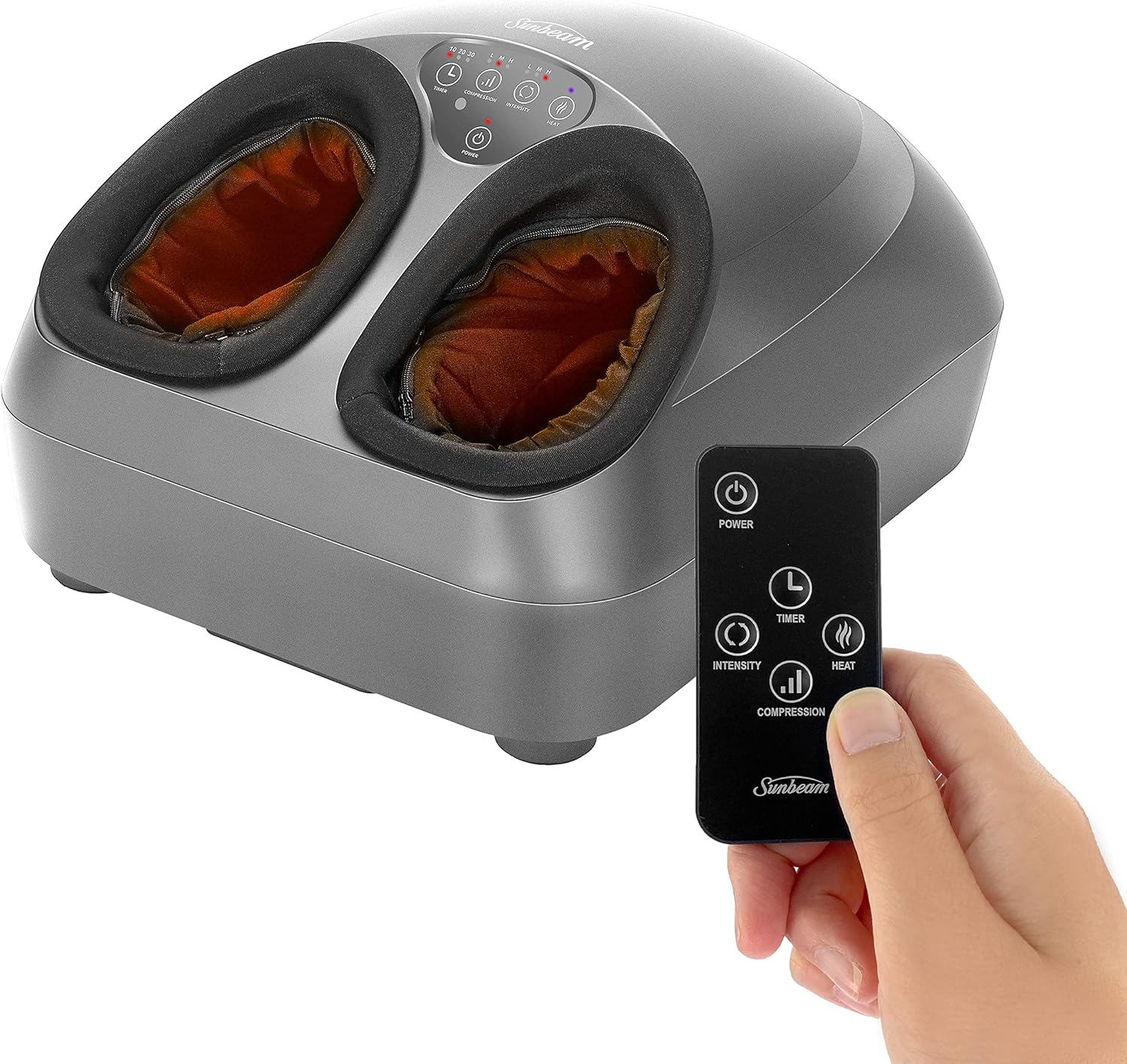 Sunbeam Máquina masajeadora de pies Shiatsu, 3 de calor, 3 compresiones, 3 ajustes de intensidad, amasado profundo, alivio y relajación para pies hinchados, cansados y fascitis plantar, control remoto.