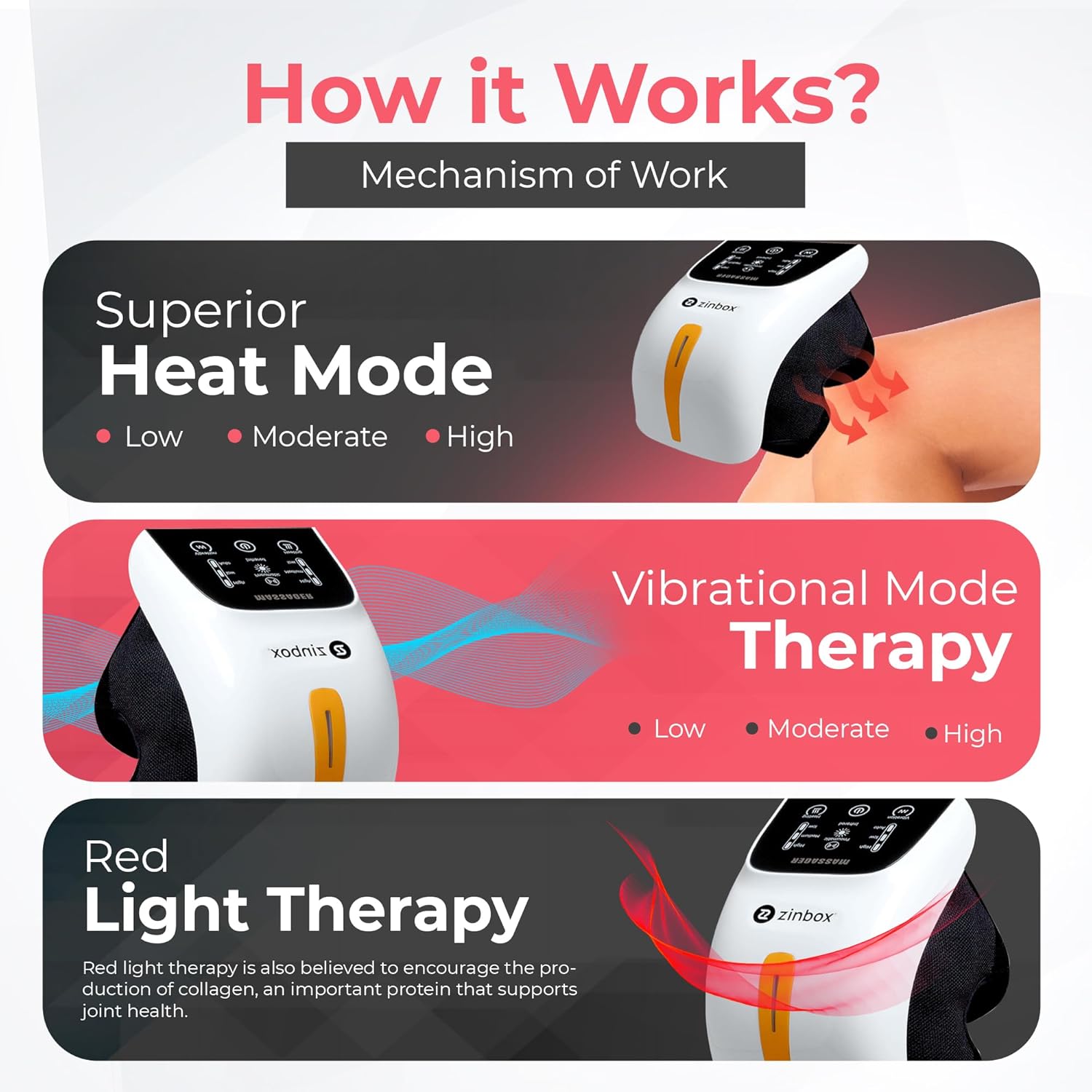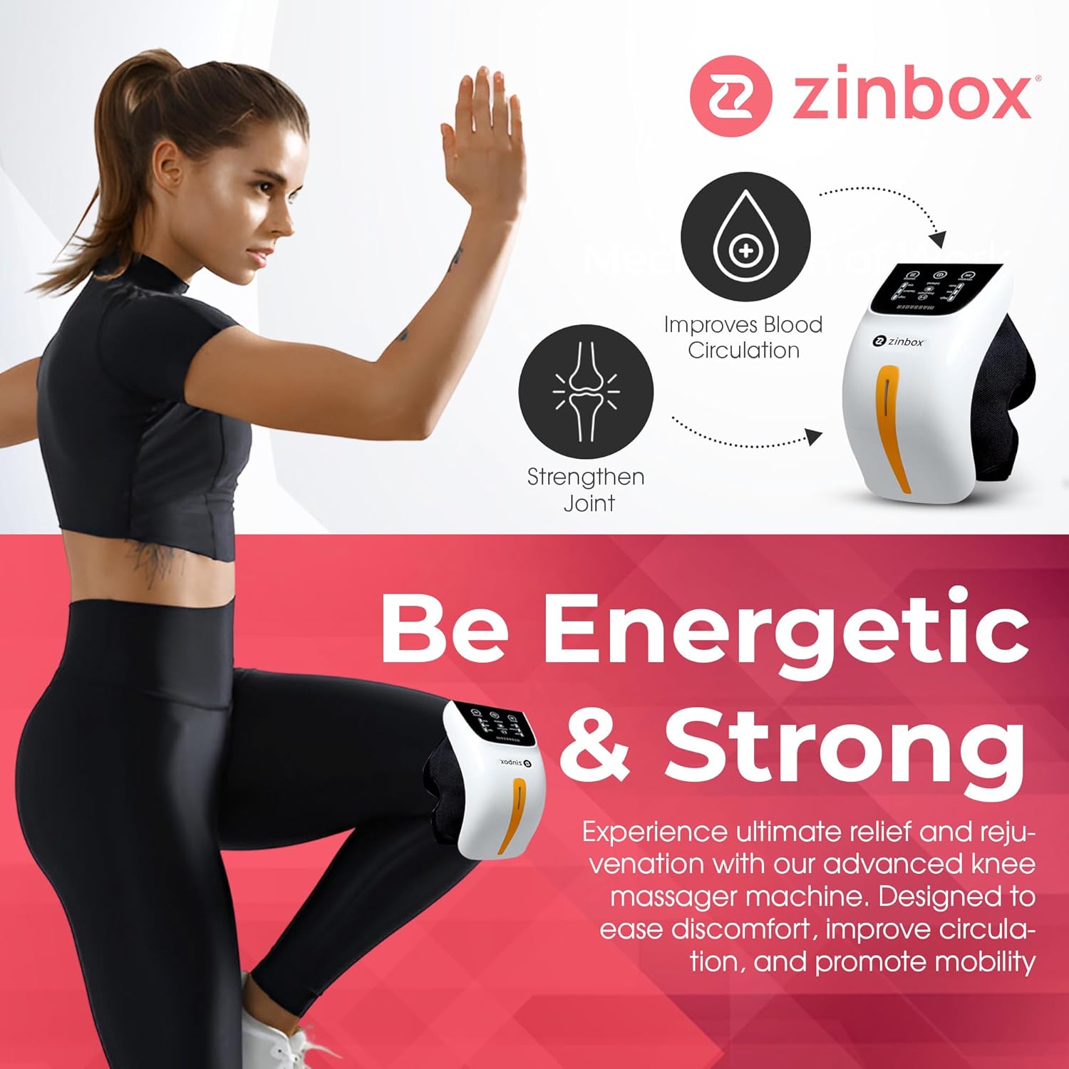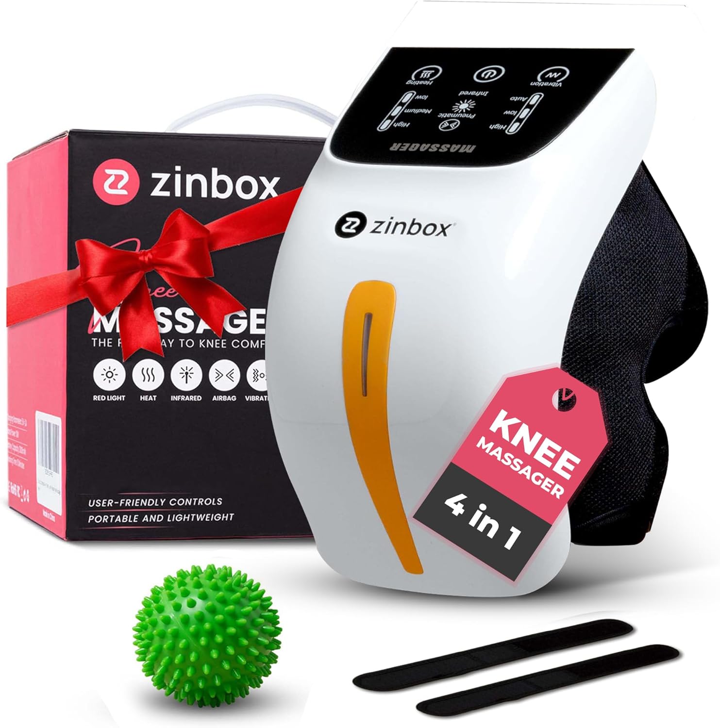 - Solución de relajación 4 en 1: Experimenta la máxima relajación con el masajeador de rodilla zinbox 4 en 1. Este innovador dispositivo combina compresión de airbag y vibración suave para una experiencia relajante. Junto con calor calmante y características de luz roja, estas técnicas trabajan juntas para mejorar la comodidad y promover una sensación de bienestar para tus rodillas.