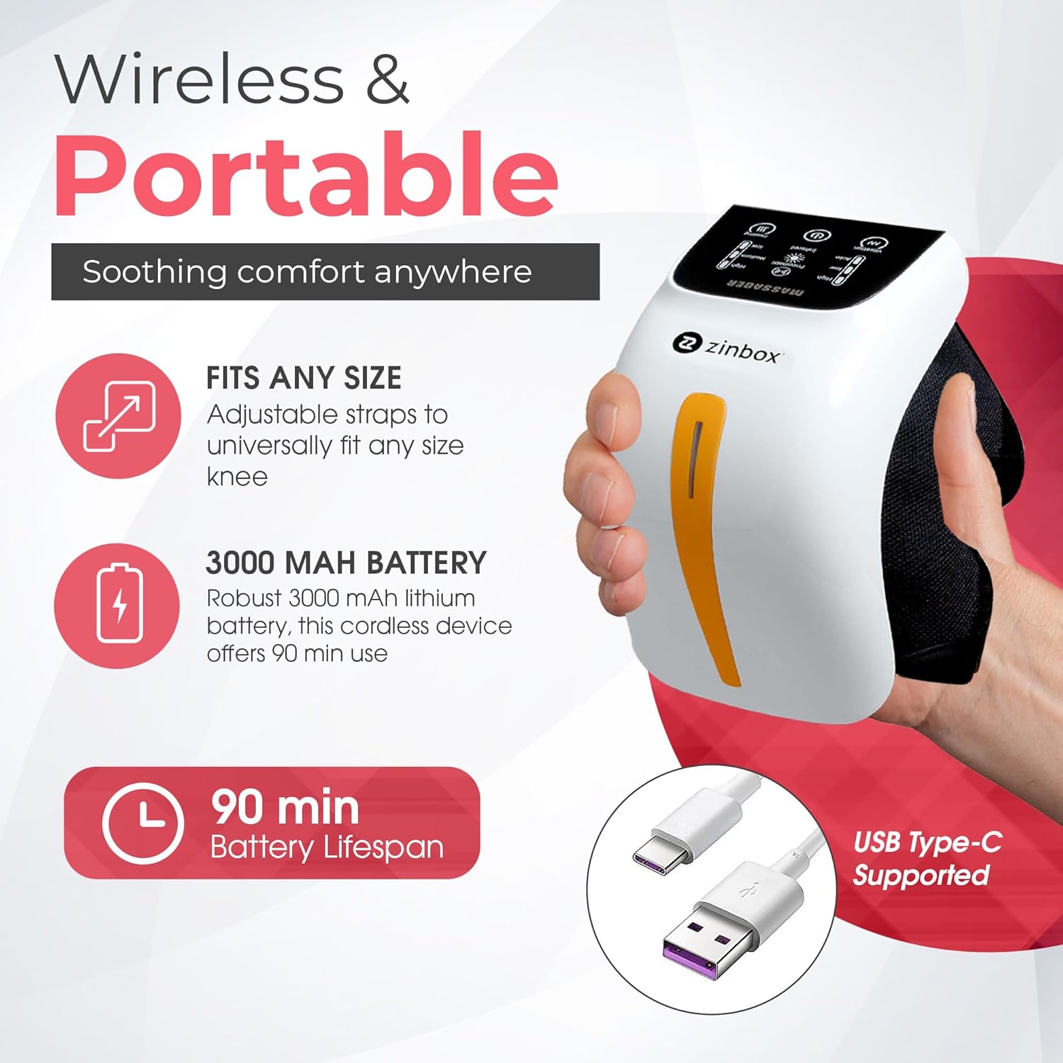 - Diseño inalámbrico y portátil: disfruta de una comodidad relajante en cualquier lugar con el masajeador de rodilla zinbox. Equipado con una robusta batería de litio de 3000 mAh, este dispositivo inalámbrico ofrece hasta 90 minutos de uso. Ya sea que estés descansando en casa o en el gimnasio después de un entrenamiento, el zinbox hace que la relajación sea fácil.