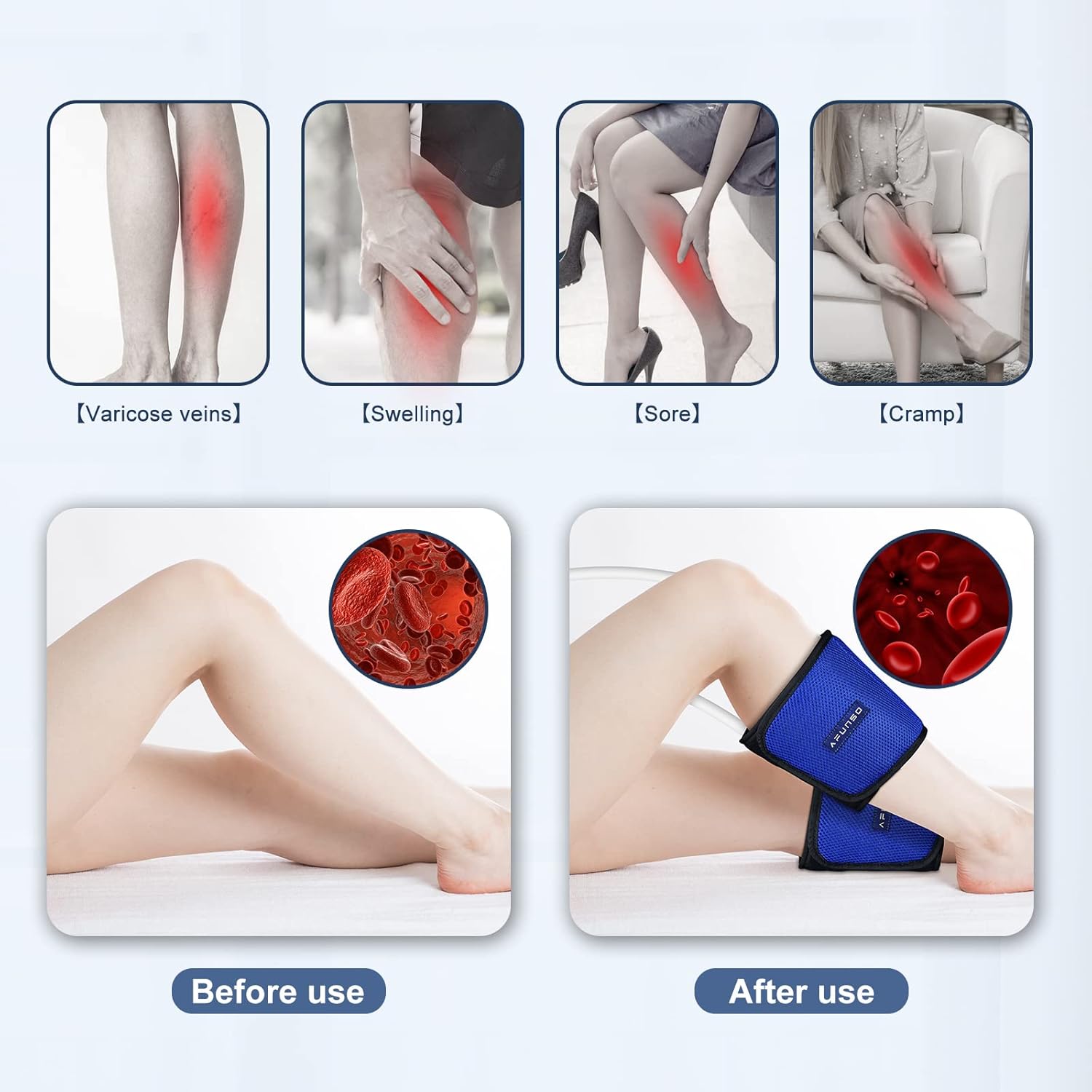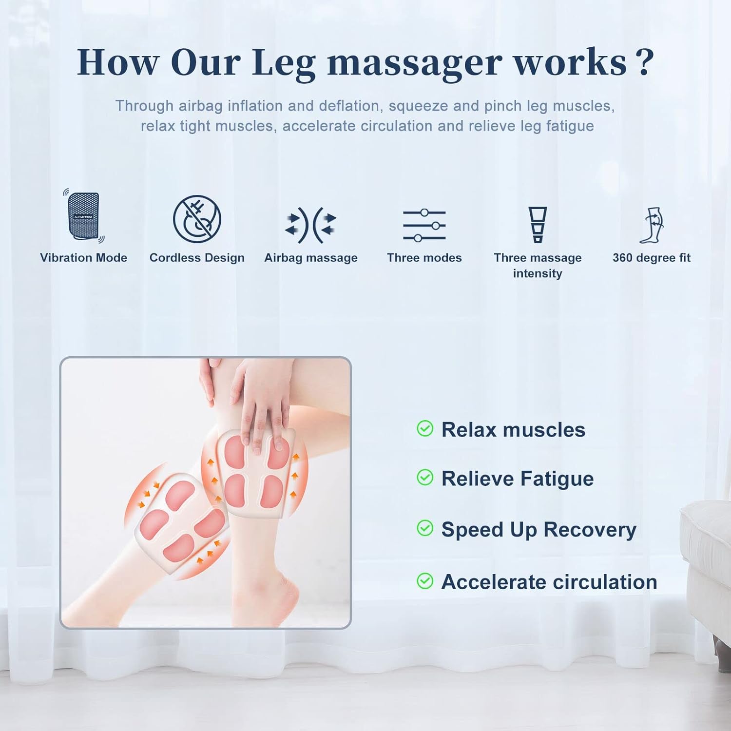 - Cómo funciona el masajeador de piernas: utilizando nuestro masajeador de piernas con compresión de aire, cubra su pantorrilla, rodilla o parte del brazo, a través del inflado y desinflado de la bolsa de aire, aprieta y pellizca los músculos de las piernas, relaja los músculos tensos, acelera la circulación y alivia la fatiga de las piernas, ofreciendo una experiencia de masaje relajante para usted.