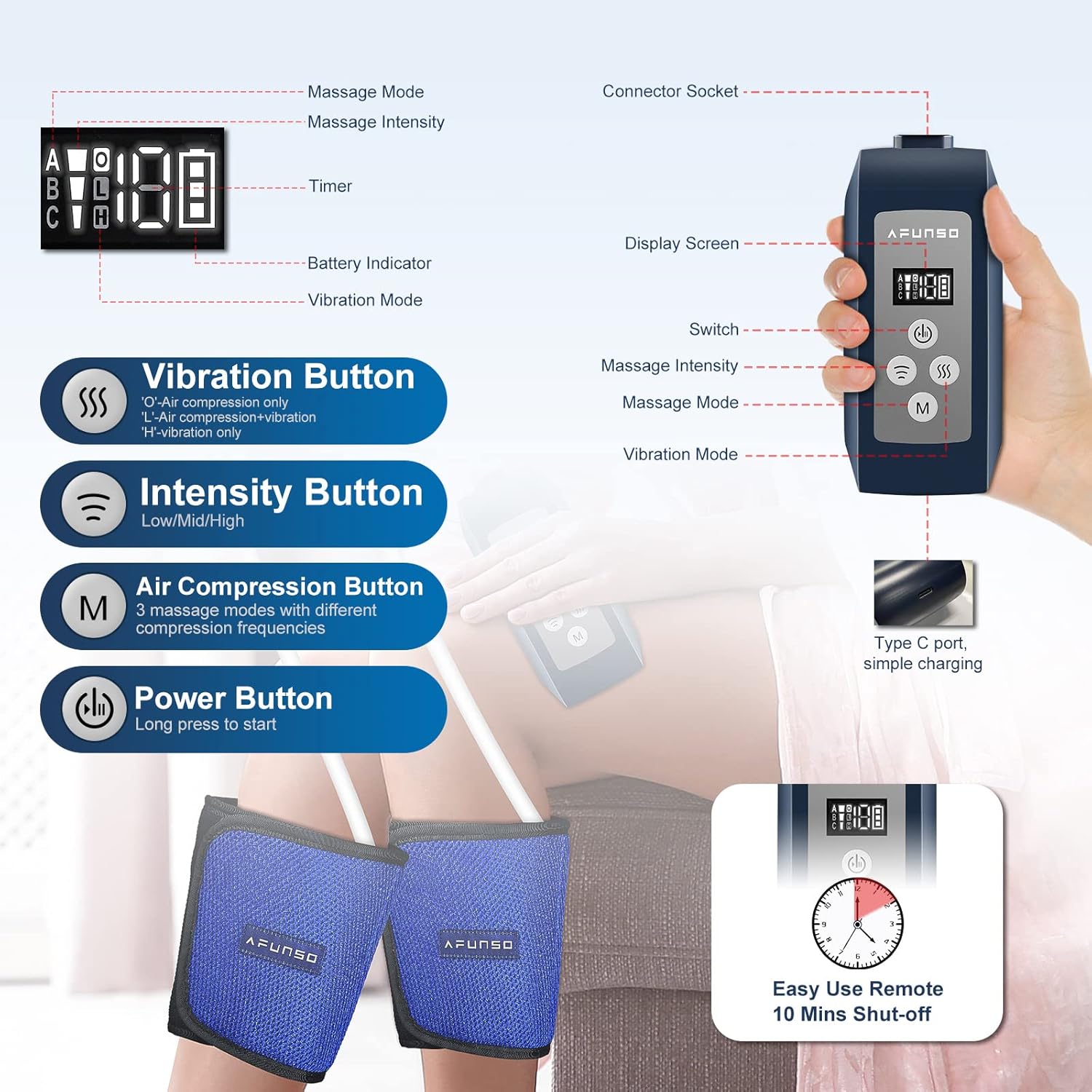 - APAGADO AUTOMÁTICO DE 10 MINUTOS: Para una experiencia de uso óptima, este masajeador de compresión de piernas para la circulación se apaga automáticamente después de 10 minutos. Su diseño con cable proporciona potencia constante en todo momento para una experiencia óptima de masaje de piernas, pies y pantorrillas. Esta función de seguridad evita el uso excesivo, ya que podría quedarse dormido después de un masaje de piernas relajante.