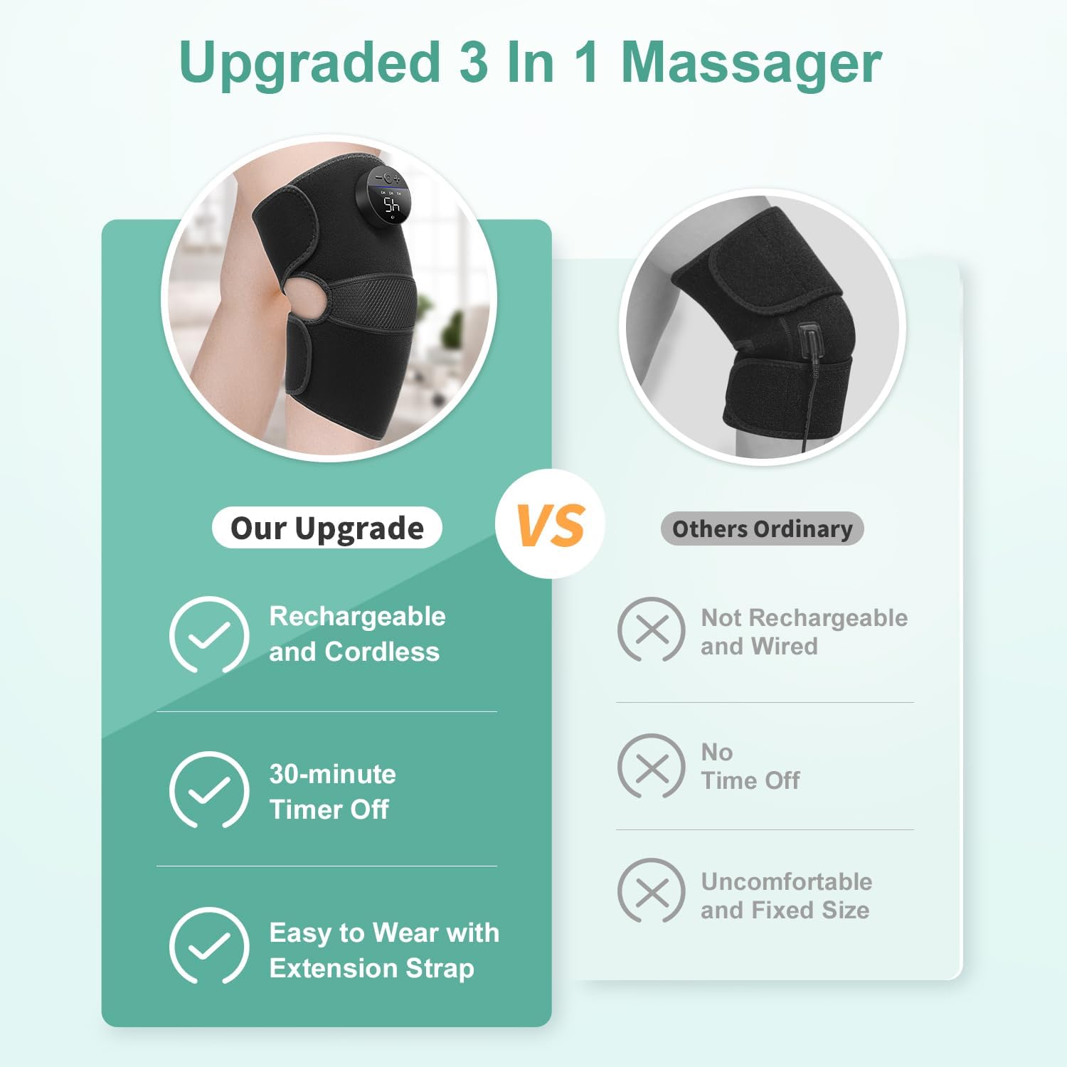 - Masajeador de rodilla con calefacción 3 en 1: este masajeador de rodilla con calefacción 3 en 1 tiene un diseño ergonómico que ayuda a proporcionar comodidad y apoyo adecuados. Cuenta con correas de velcro ajustables para un uso fácil y seguro. Viene con una correa de extensión de 23 pulgadas, lo que te permite usarla en el codo, los hombros y otras partes del cuerpo para reducir el dolor y mejorar el flujo de sangre.