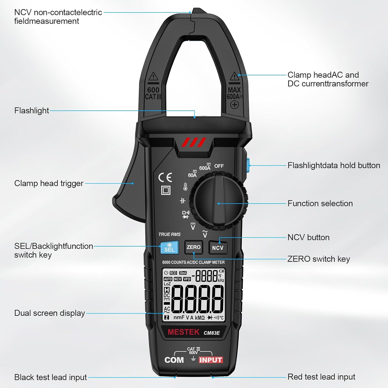 - Medidor de abrazadera de CA CC True-RMS: el medidor de abrazadera MESTEK puede medir con precisión una corriente máxima de 600 A CA/CC, voltaje de 600 V CA/CC, resistencia, capacitancia, continuidad, temperatura, diodo; una útil herramienta de solución de problemas que te ayudará a resolver problemas eléctricos en el automóvil, industrial o en casa de forma rápida y segura, perfecto para electricistas, bricolaje, profesionales, etc