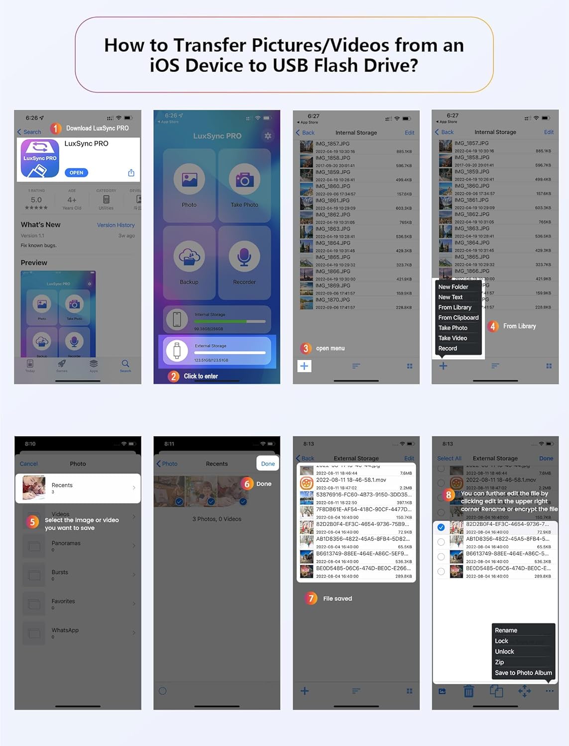 - Compatibilidad y velocidad de transferencia: las unidades flash son compatibles con dispositivos iOS 12.1 o superiores, teléfonos Android OTG/computadoras y otros dispositivos con puertos USB. Con hasta 80 MB/s de lectura y 40 MB/s de velocidad de escritura, puedes ahorrar mucho tiempo de espera. También puedes compartir documentos/fotos directamente desde el almacenamiento de fotos a redes sociales como: Facebook, Twitter, etc. Utiliza el lápiz de fotos para iPhone para compartir datos fácilmente con familiares, amigos y colegas, haciendo que el entretenimiento y el trabajo sean más interesantes.