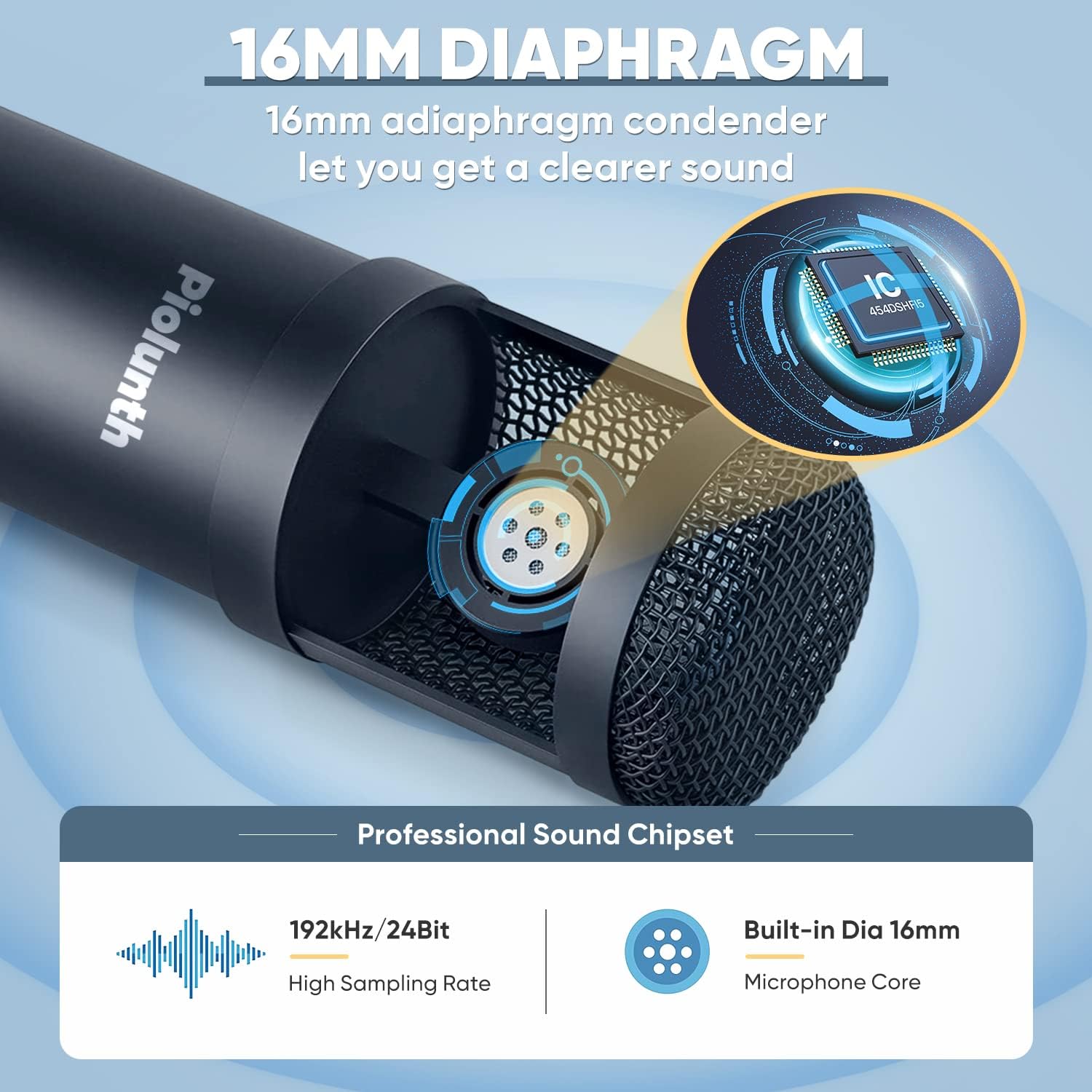 - Micrófono USB, este micrófono condensador ha sido diseñado con chipset de sonido profesional, el diseño de cápsula de micrófono de 16 mm ofrece un sonido rico y detallado. Soporta velocidades de muestreo de hasta 192 kHz/24 bits. Amplia respuesta de frecuencia y alto nivel de presión de sonido permiten que el micrófono obtenga un sonido más real y delicado.