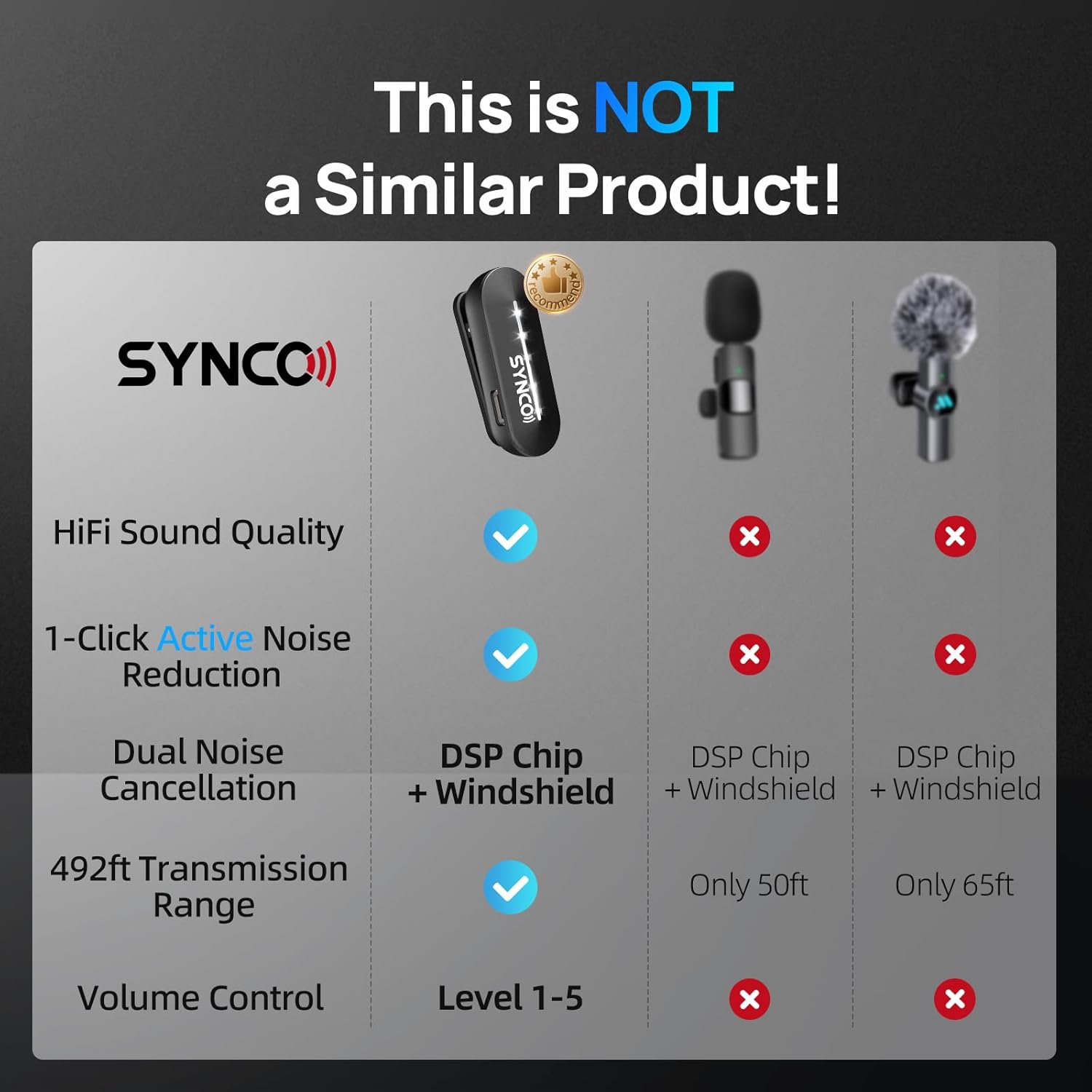 - Grabaciones claras en un rango de 492 pies/150 m: Los micrófonos de solapa SYNCO funcionan con Syncoder 3.0 y un chip DSP inteligente, son ideales para videollamadas o grabaciones, filtran el ruido de fondo y brindan un sonido claro hasta, ideal para entrevistas, reuniones virtuales, toma de podcasts, vlogs, transmisión en vivo, interior y exterior, dispositivo ideal para creadores de videos de YouTube y TikTok.