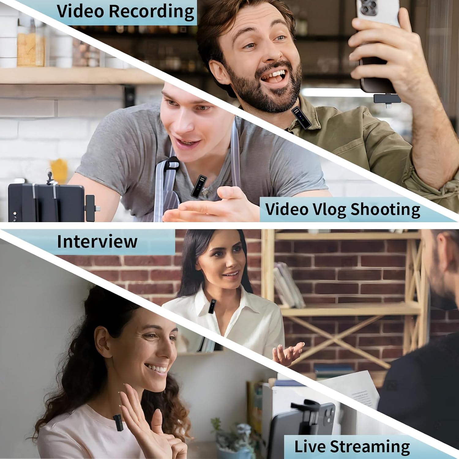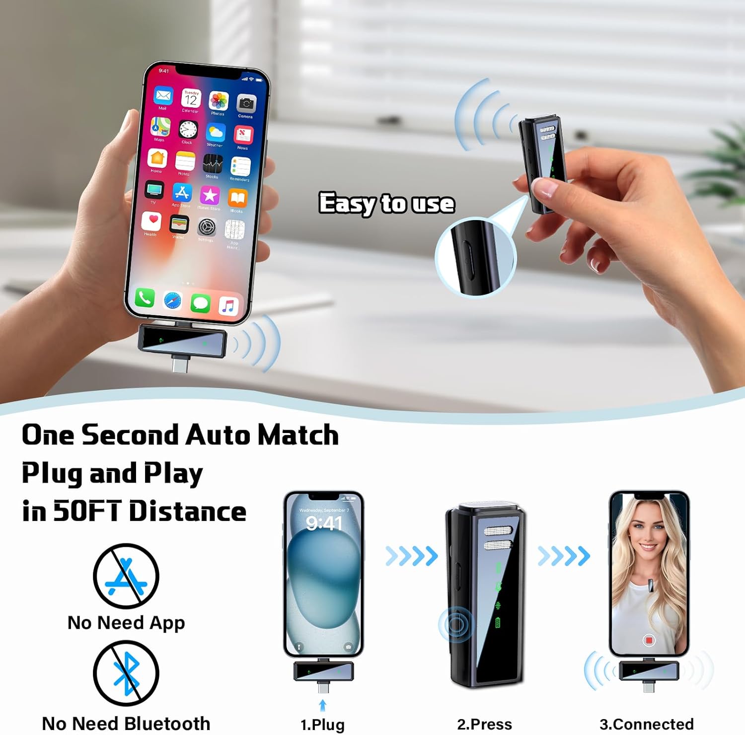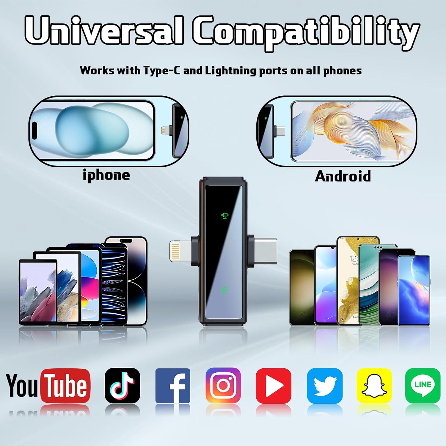 - Fácil de usar. Este micrófono inalámbrico es compatible con todos los dispositivos tipo C y puerto Lightning, como iOS (iPhone 15/15 Pro/ Pro Max, etc.) y casi todos los teléfonos Android (Samsung, Google Pixel, OnePlus) y tabletas.