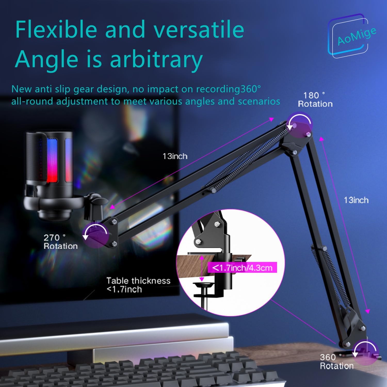 - Boom flexible del brazo: la pluma de metal fácil de colocar se ajusta para soportar una variedad de configuraciones, y puedes tirar rápidamente del micrófono de podcast a tu boca cuando estés en uso, o doblarlo para ahorrar más espacio.