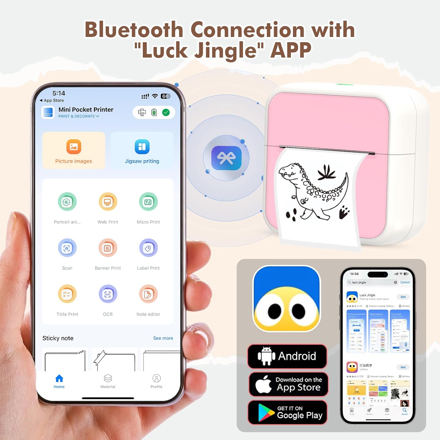 - Modo de Empleo- Simplemente descargue la aplicación "Luck Jingle" y comience su viaje de impresión. Hay tres maneras de empezar rápidamente: 1. escanear el código QR en las instrucciones incluidas. 2. Busca "Luck Jingle" en Google Play. 3. Busca "Luck Jingle" en App Store. Enciende la impresora inalámbrica de pegatinas y la conexión Bluetooth de tu teléfono móvil, abre la app «Luck Jingle» y conecta el dispositivo.
