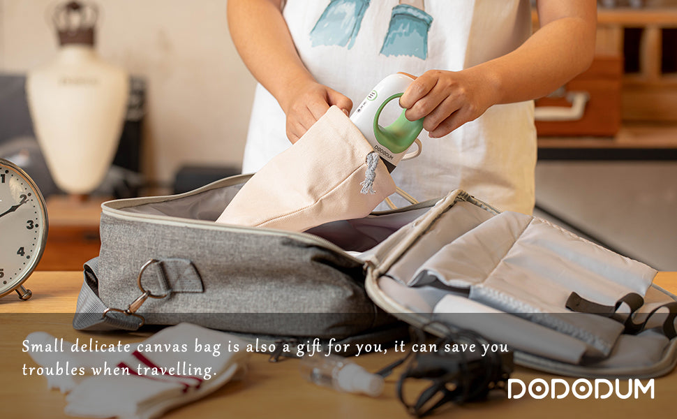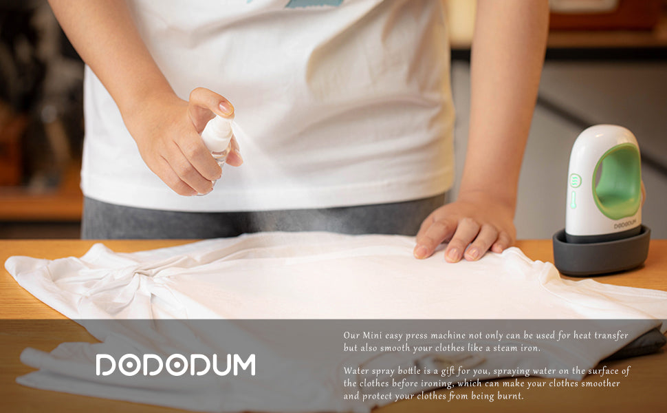 - DODODUM Mini máquina de prensa de calor es muy pequeña y fácil de llevar. El paquete viene con una botella de spray de agua y una pequeña bolsa de lona. Rocíe una pequeña cantidad de agua antes de cada planchado hará que su trabajo sea más sencillo. Coloca la máquina DODODUM Easypress Mini en la bolsa de lona después de trabajar para facilitar tu almacenamiento.