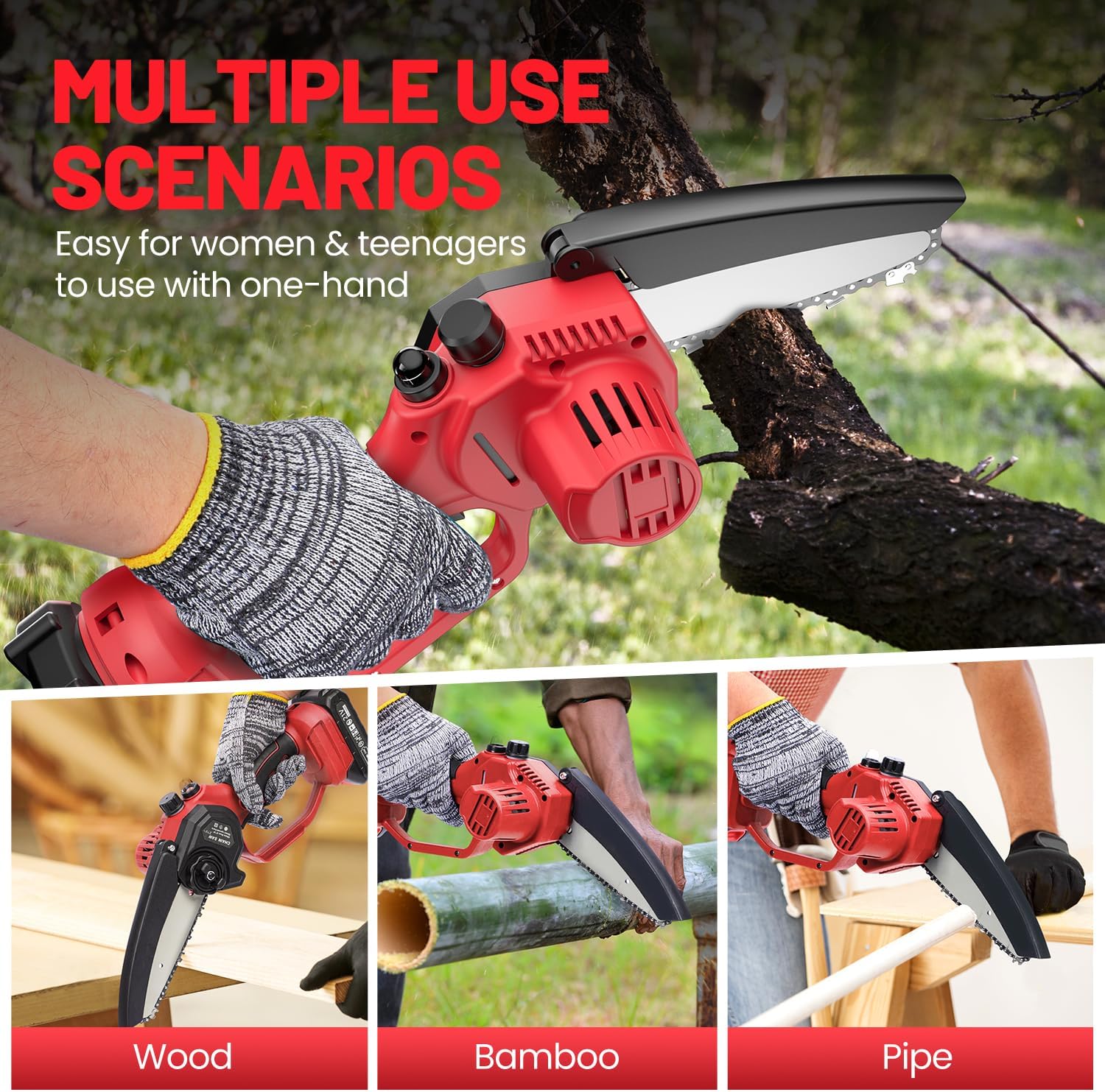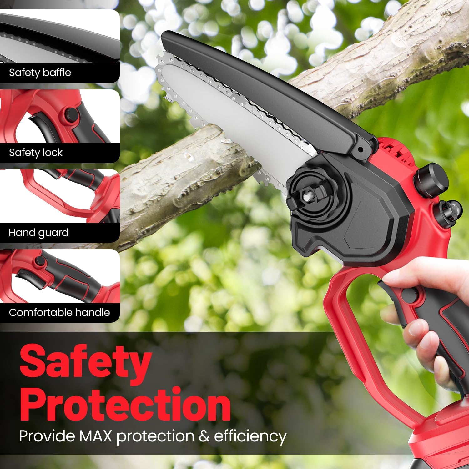 - Protección multiseguridad: segura para todos los usuarios: diseñada con un botón de bloqueo de seguridad, protector de mano y mango antideslizante, esta motosierra de mano garantiza un funcionamiento seguro. La mini motosierra comienza solo cuando el interruptor de seguridad y el botón de encendido se presionan simultáneamente, evitando la activación accidental o contratiempos. Ideal para principiantes y usuarios experimentados por igual.