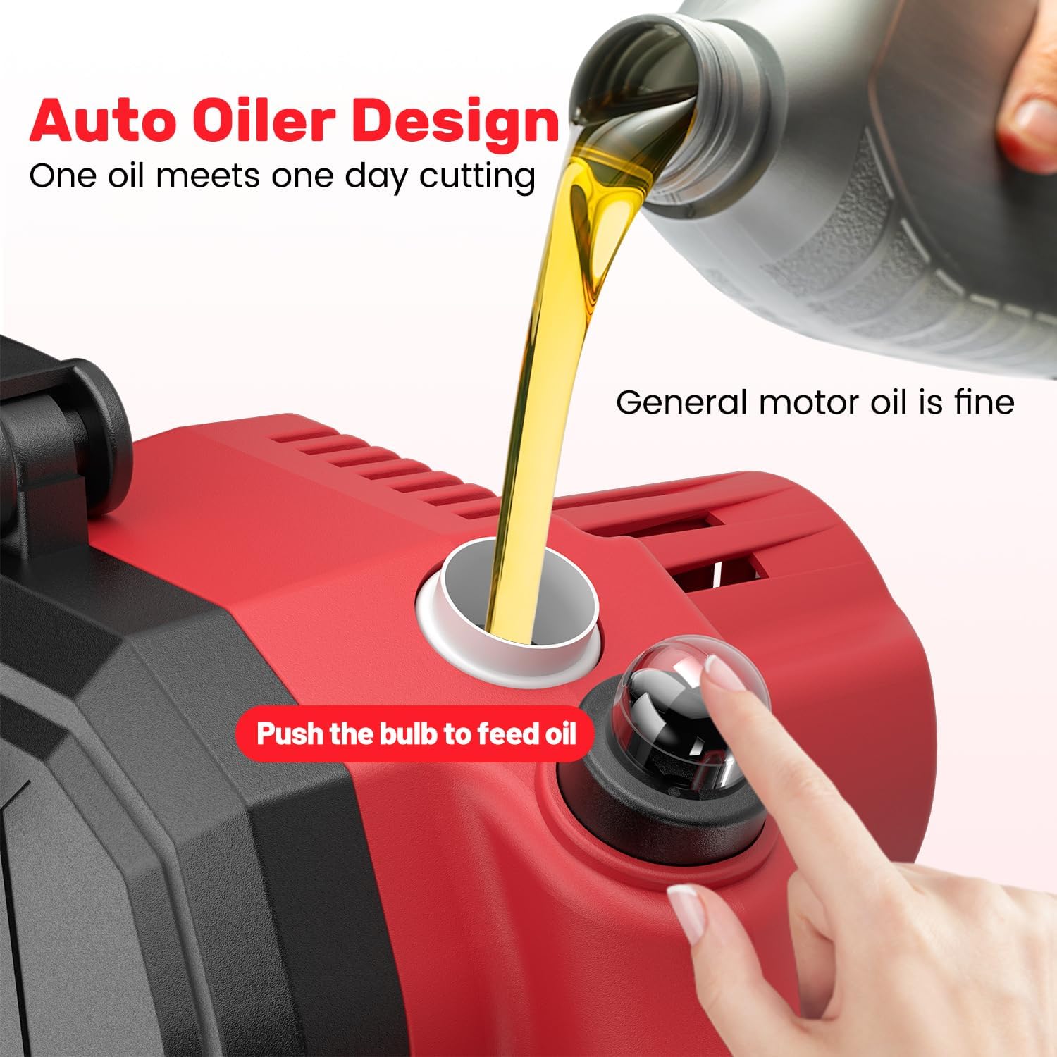 - Sistema de engrasador automático: cortes más suaves y duraderos: la mini motosierra inalámbrica de 6 pulgadas cuenta con un sistema de engrasador automático integrado que mantiene la cadena lubricada para un corte más suave, rápido y eficiente. Simplemente llena el tanque de aceite (trabajos generales de aceite) de la mini motosierra y presiona la bombilla para lubricar. Un relleno de aceite dura todo el día, eliminando la necesidad de llevar botellas de lubricante pesadas.