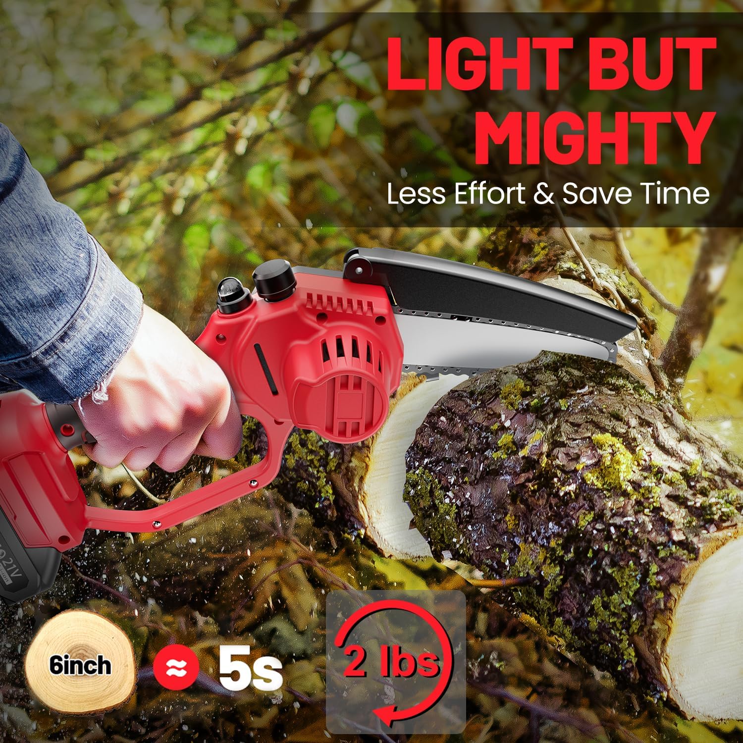 Mini motosierra inalámbrica de 6", 2 baterías y 3 cadenas, portátil.