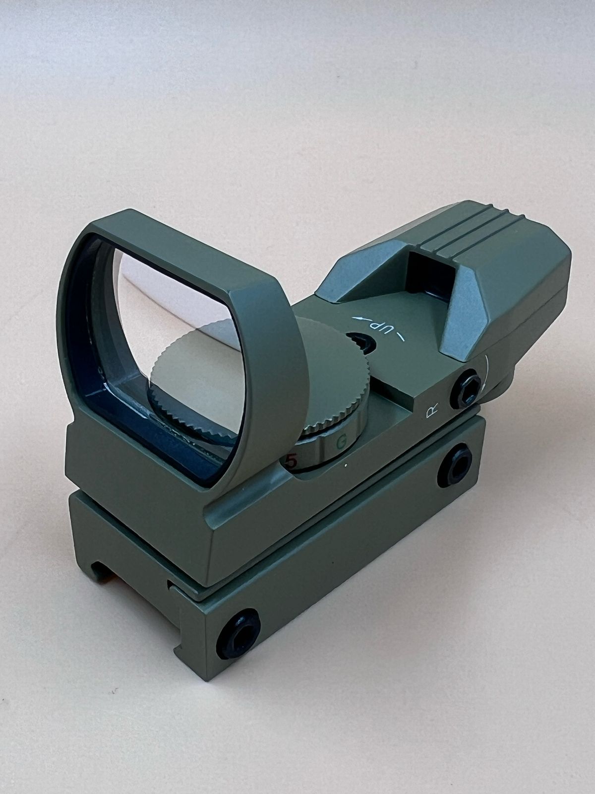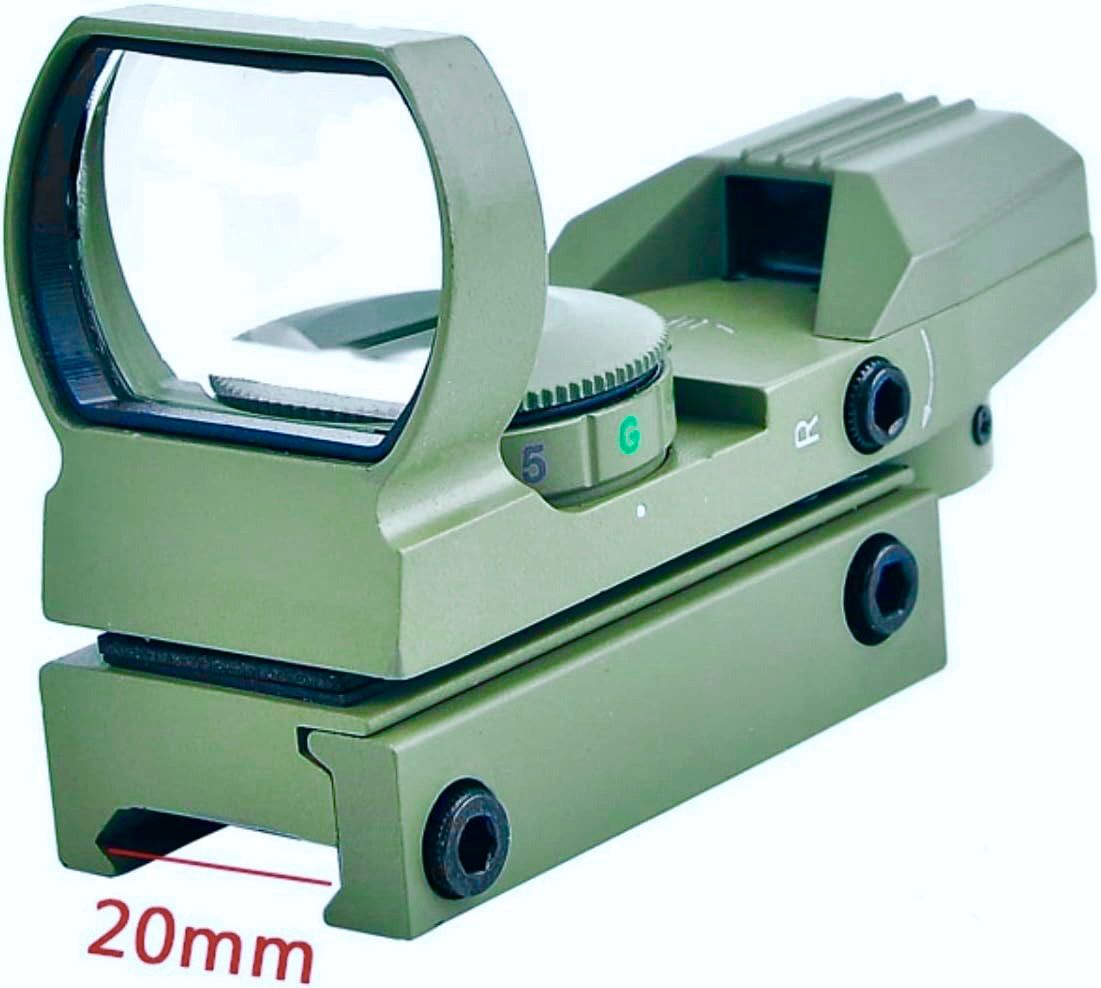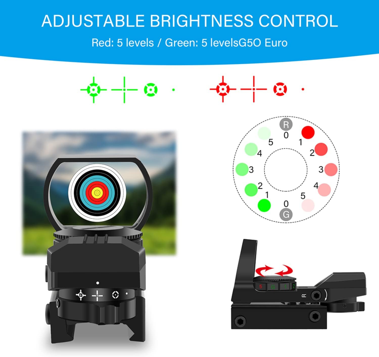 - Doble iluminación (roja y verde); 4 formas de retícula en una mira réflex, brindan varias opciones en diferentes ocasiones, como sol o días nublados.