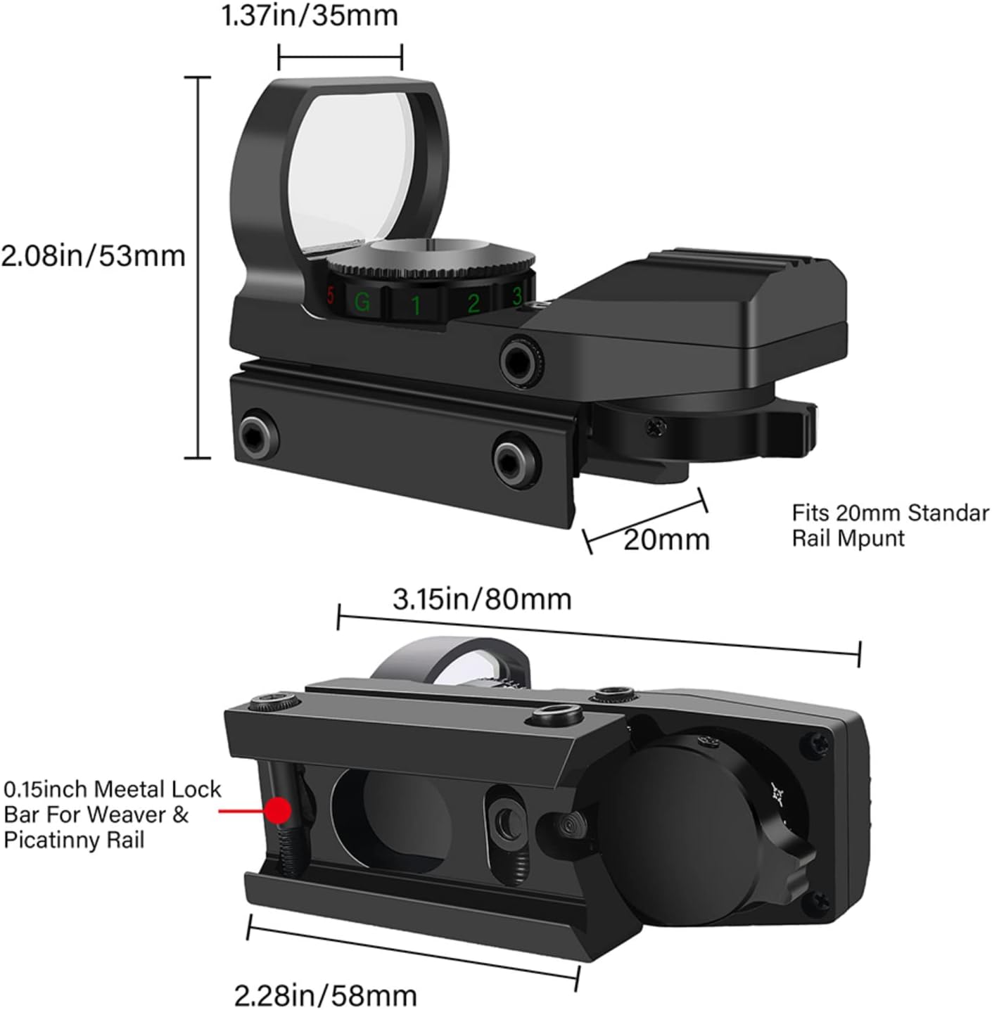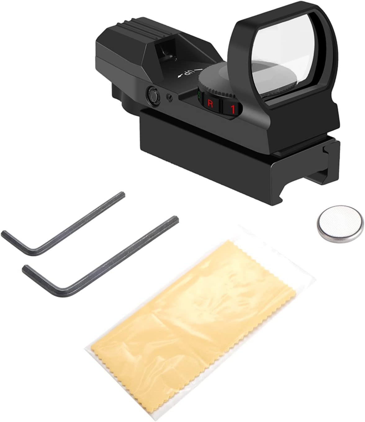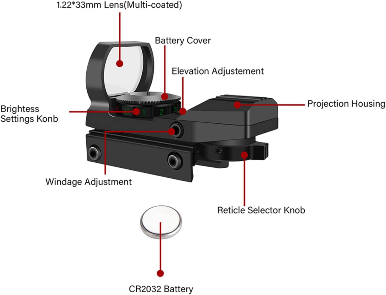 - La mira de punto rojo está mecanizada con precisión a partir de una aleación de aluminio de alta calidad con anodizado negro mate e incluye una base de montaje Picatinny de perfil estándar. La mira réflex con lentes multicapa proporciona una visión brillante y nítida.