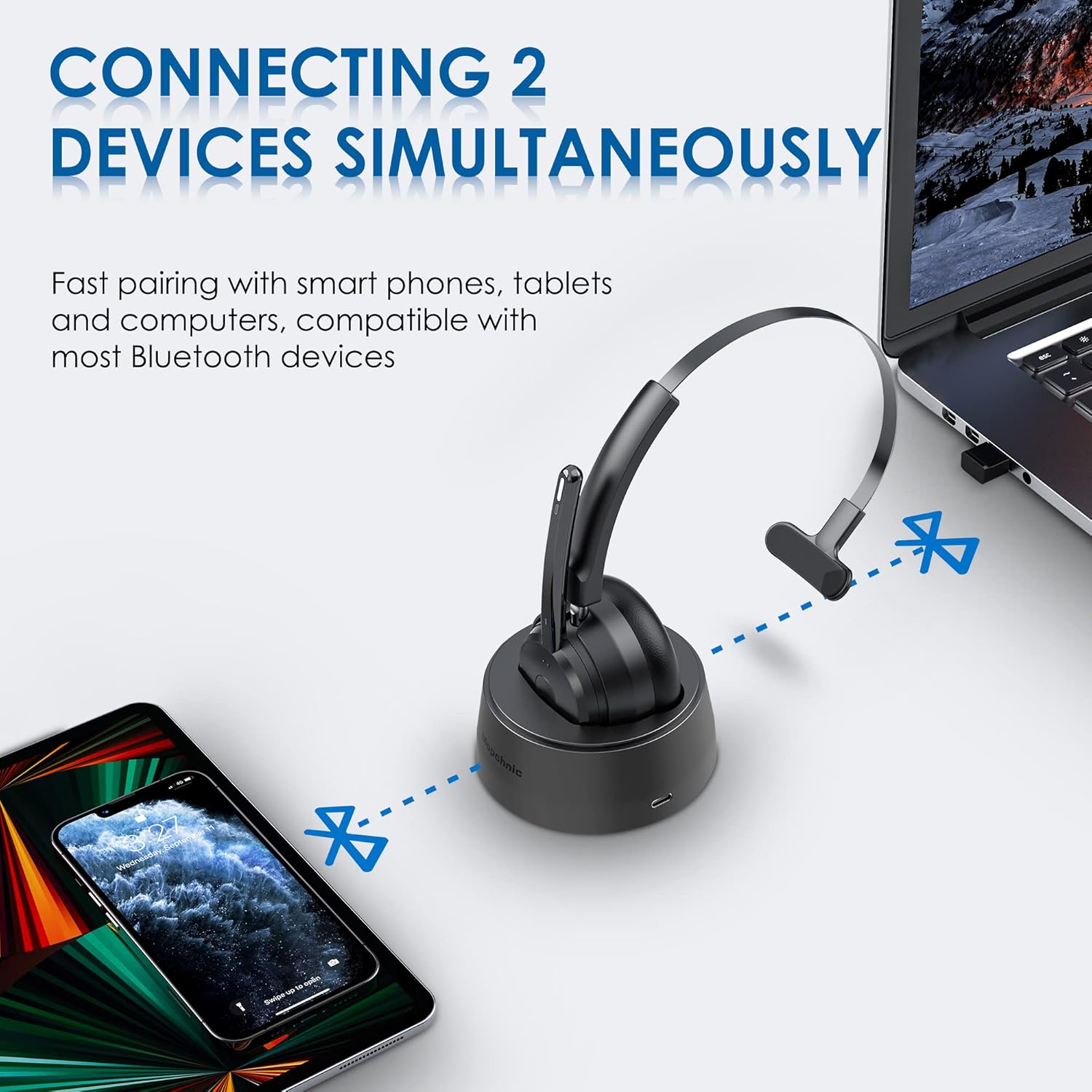 - Los auriculares inalámbricos Mopchnic se adaptan a la última versión Bluetooth 5.0, que proporciona una conexión más estable y es compatible con teléfonos celulares, portátiles, computadoras y otros dispositivos Bluetooth. Puede utilizar el dongle USB para conectarse a dispositivos que no tienen capacidades Bluetooth. Además, este auricular Bluetooth con micrófono admite dos conexiones de dispositivos.