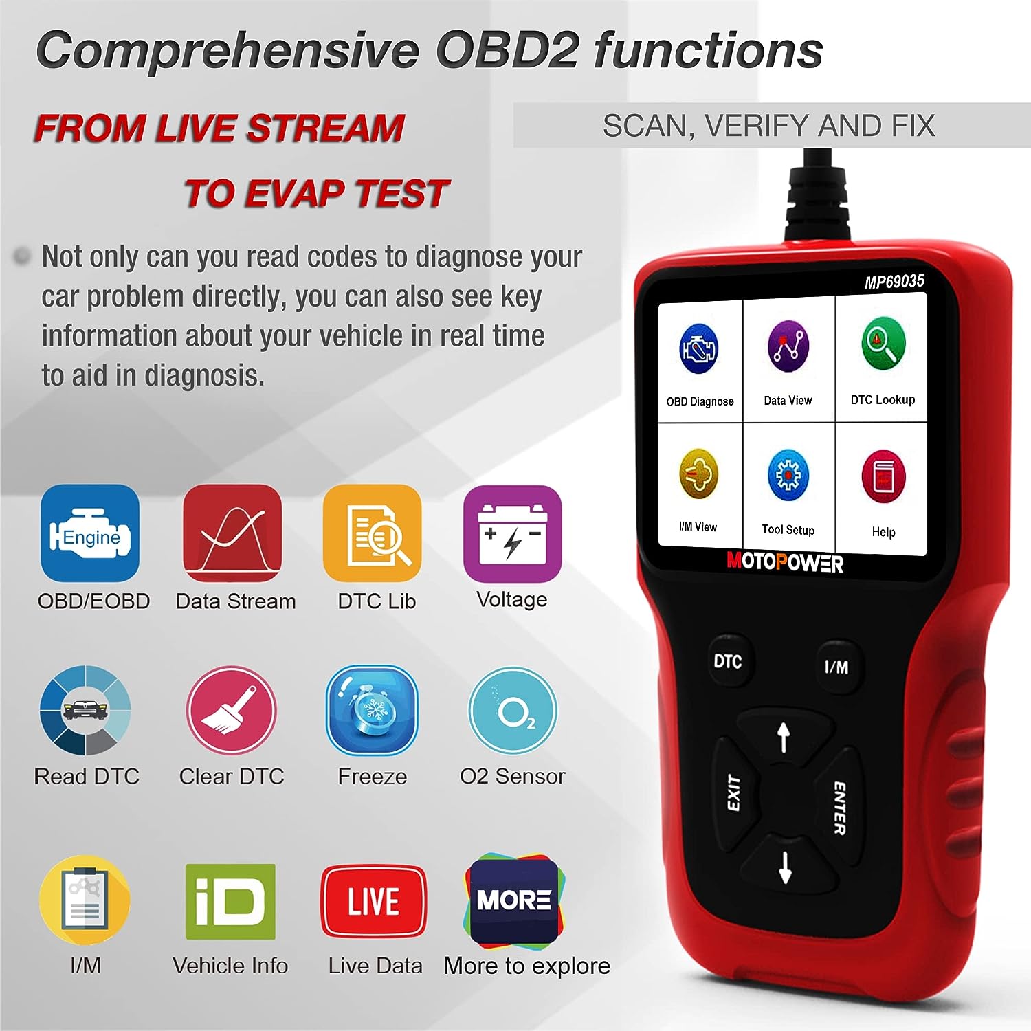 - Diagnóstico de nivel profesional: como escáner profesional de automóvil, el MP69035 tiene todas las funciones OBD2 que necesitas, que incluyen códigos de lectura y claridad, apaga la luz del motor o MIL, ver flujo de datos en vivo, lectura I/M, ver marco de congelación, recupera datos VIN del vehículo, prueba de voltaje de la batería, prueba del sensor de O2, verificación de modo de monitoreo a bordo y más para explorar.