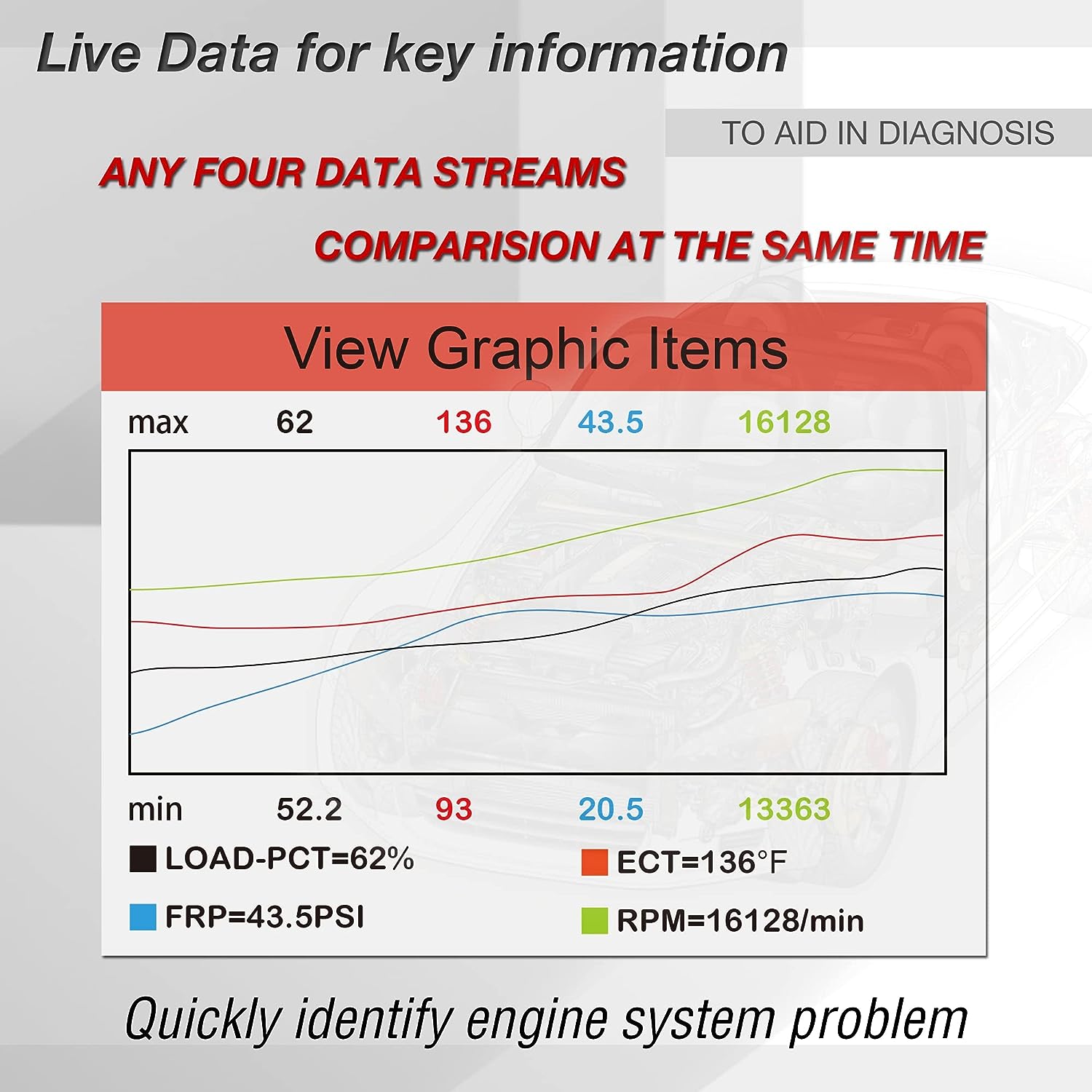 - visualización completa de datos de vehículos en tiempo real: en comparación con otros lectores de códigos baratos, nuestros lectores de códigos y herramientas de escaneo pueden mostrar datos de sensores de vehículos en tiempo real tanto en formatos de texto como gráficos, lo que te permite visualizarlos de forma más intuitiva, como calcular valores de carga, temperatura del refrigerante del motor, velocidad del motor, velocidad del vehículo, sensores de flujo de aire y mucho más. Además, puedes ver los datos del marco congelado y compararlos con los datos en tiempo real y los códigos de falla para comprender mejor lo que está sucediendo con tu vehículo.