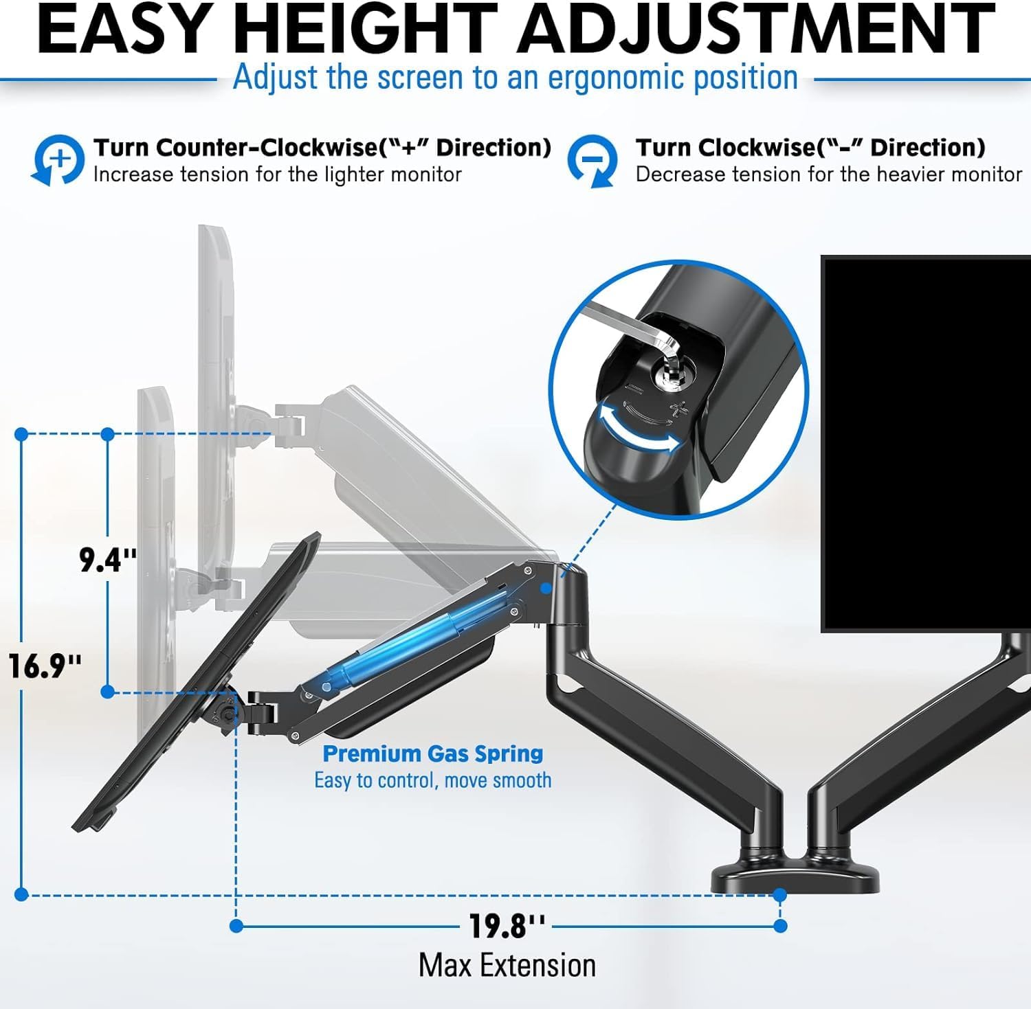 - Brazos de resorte de gas de alta calidad: Soporte de monitor dual con sistema de resorte de gas, proporciona ajustes de altura suaves y duraderos. El brazo del monitor proporciona un rango de ajuste de altura de 24 cm y extensión de hasta 50 cm. Ajusta la tensión del brazo de resorte de gas correctamente de acuerdo con el peso de tu monitor.