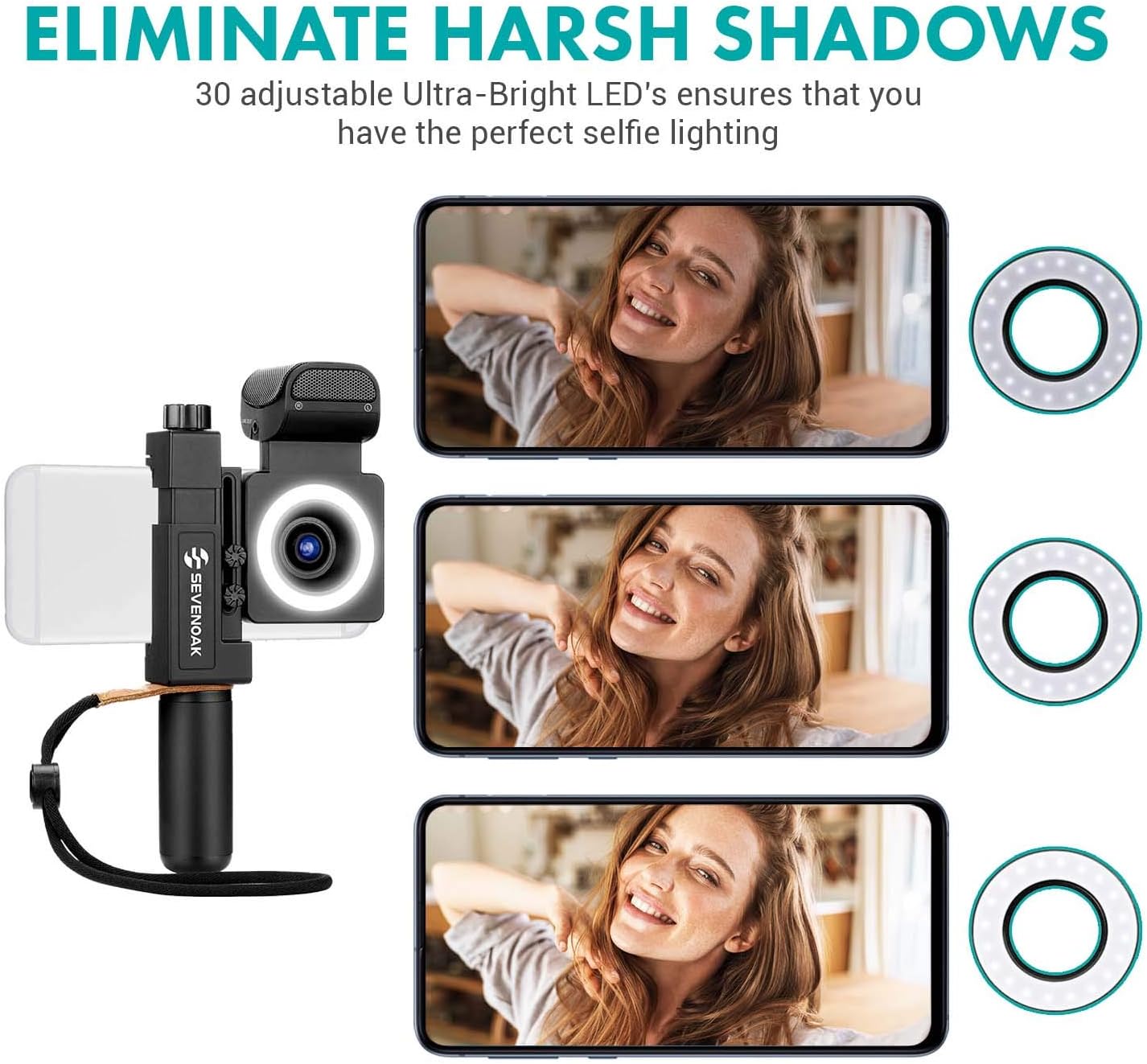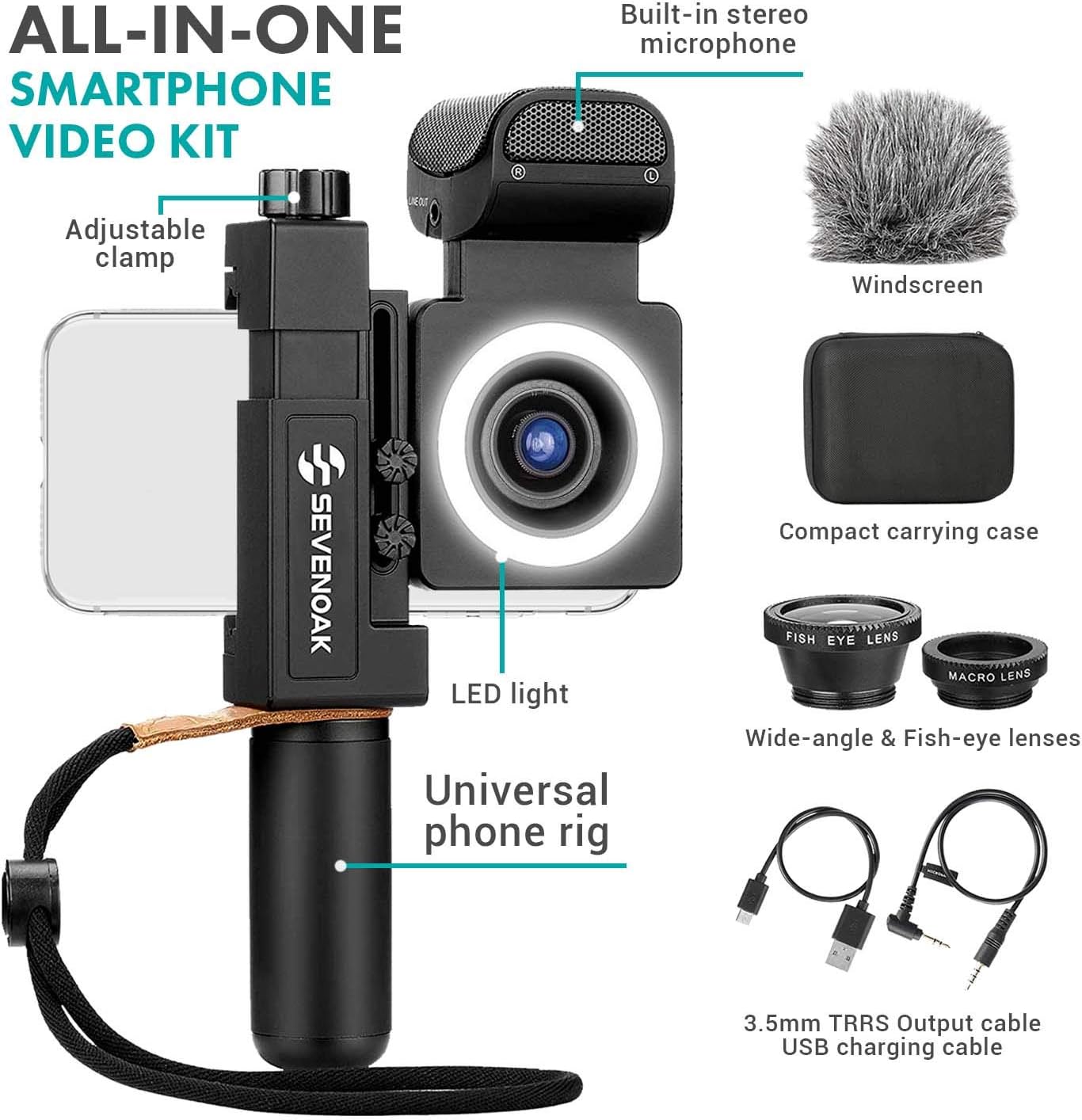 - Kit de video inteligente todo en uno: cuenta con un aparejo de teléfono universal, lentes de gran angular y ojo de pez, micrófono estéreo integrado y luz LED