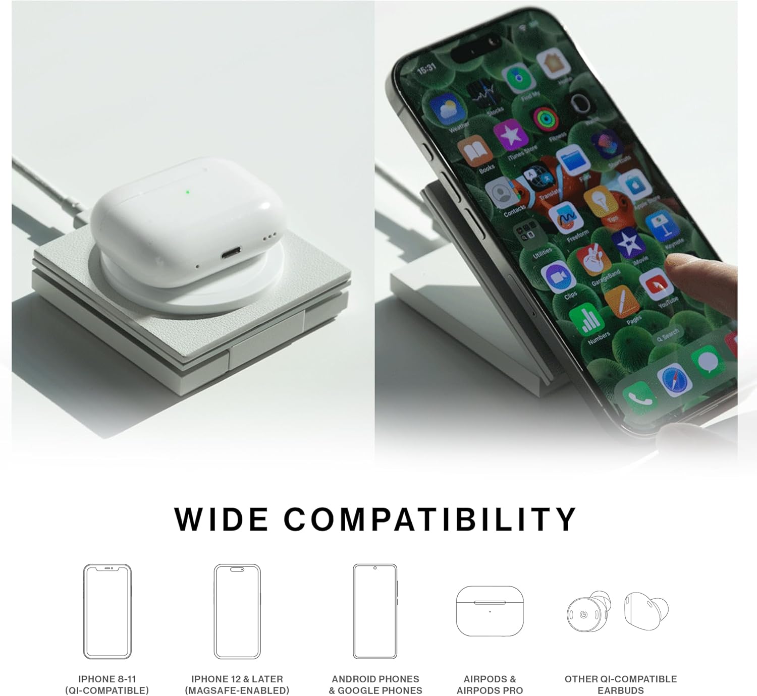 - Amplia compatibilidad: se ajusta magnéticamente en su lugar para un uso perfecto de tu iPhone 12 o posterior, mientras que también es compatible con AirPods, AirPods Pro, teléfonos inteligentes Android y Google, y otros dispositivos compatibles con Qi cuando el cargador está acostado.