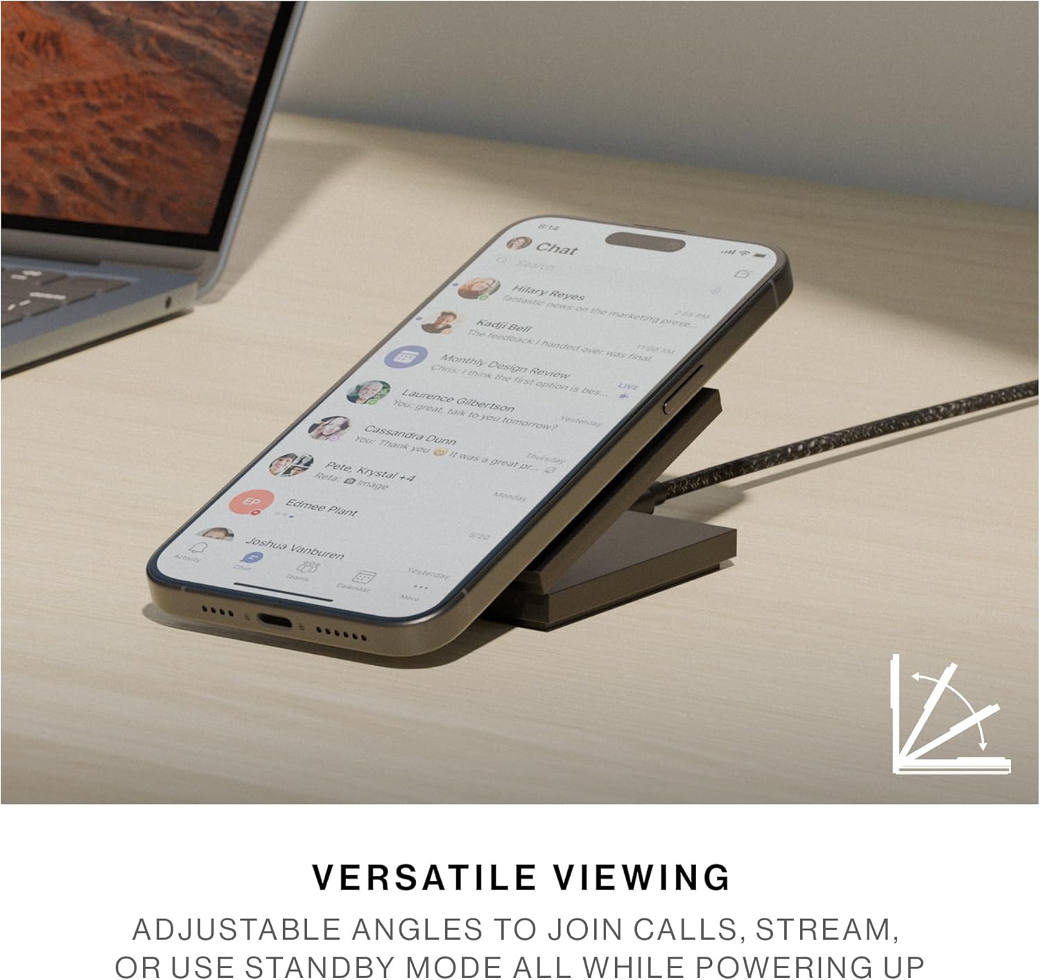 - SOPORTE AJUSTABLE: Levante su cargador en ángulos ajustables para disfrutar de la visualización de iPhone con manos libres: únase a llamadas, transmita o use el modo StandBy todo mientras se enciende.