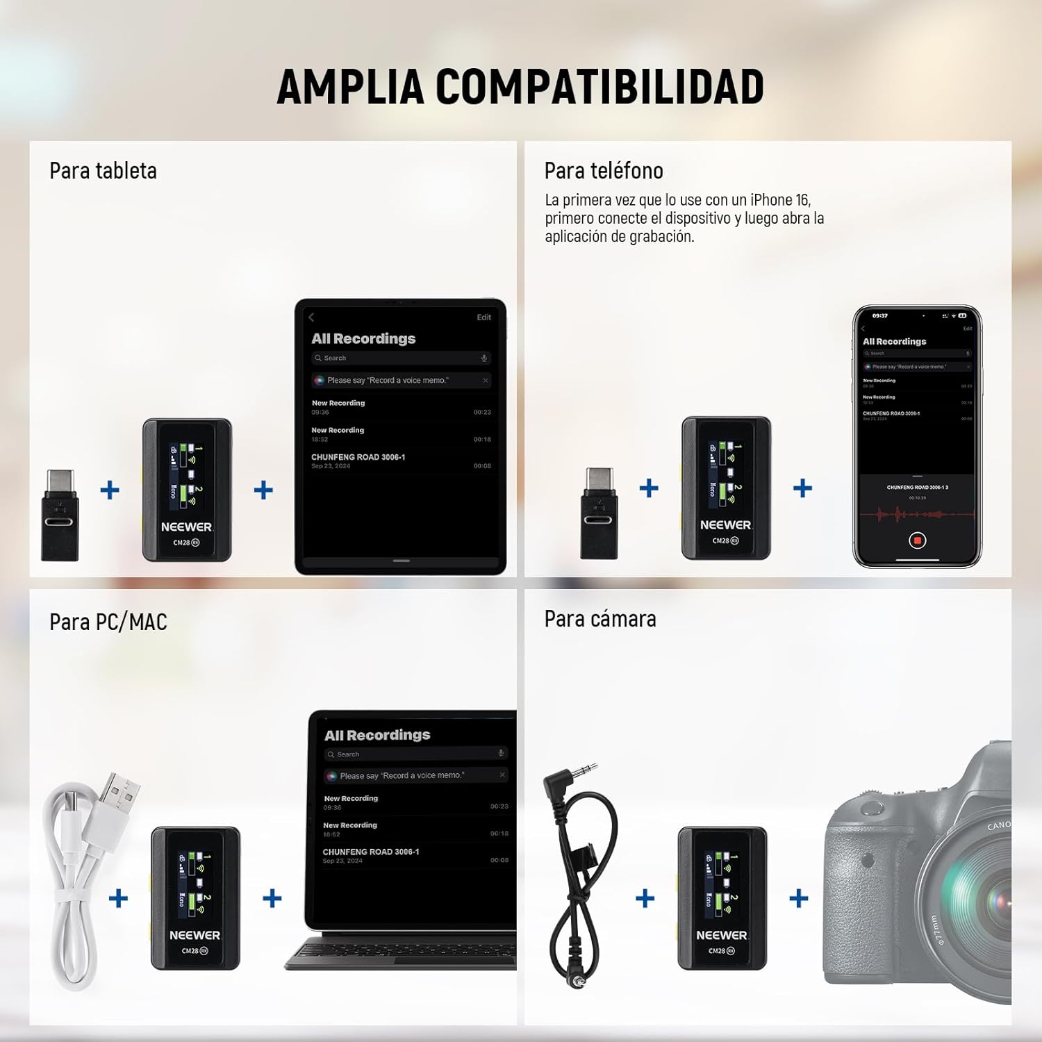- Reducción de Ruido y Grabación con Un Solo Clic. El chip de cancelación de ruido avanzado incorporado en los transmisores TX le permite lograr una grabación de voz clara y nítida con un solo clic del mismo botón. Dos indicadores LED para mostrar diferentes estados de grabación. También incluye dos paravientos para la reducción de ruido y un imán para fijar los micrófonos de solapa magnéticamente en los collares o en cualquier otro lugar