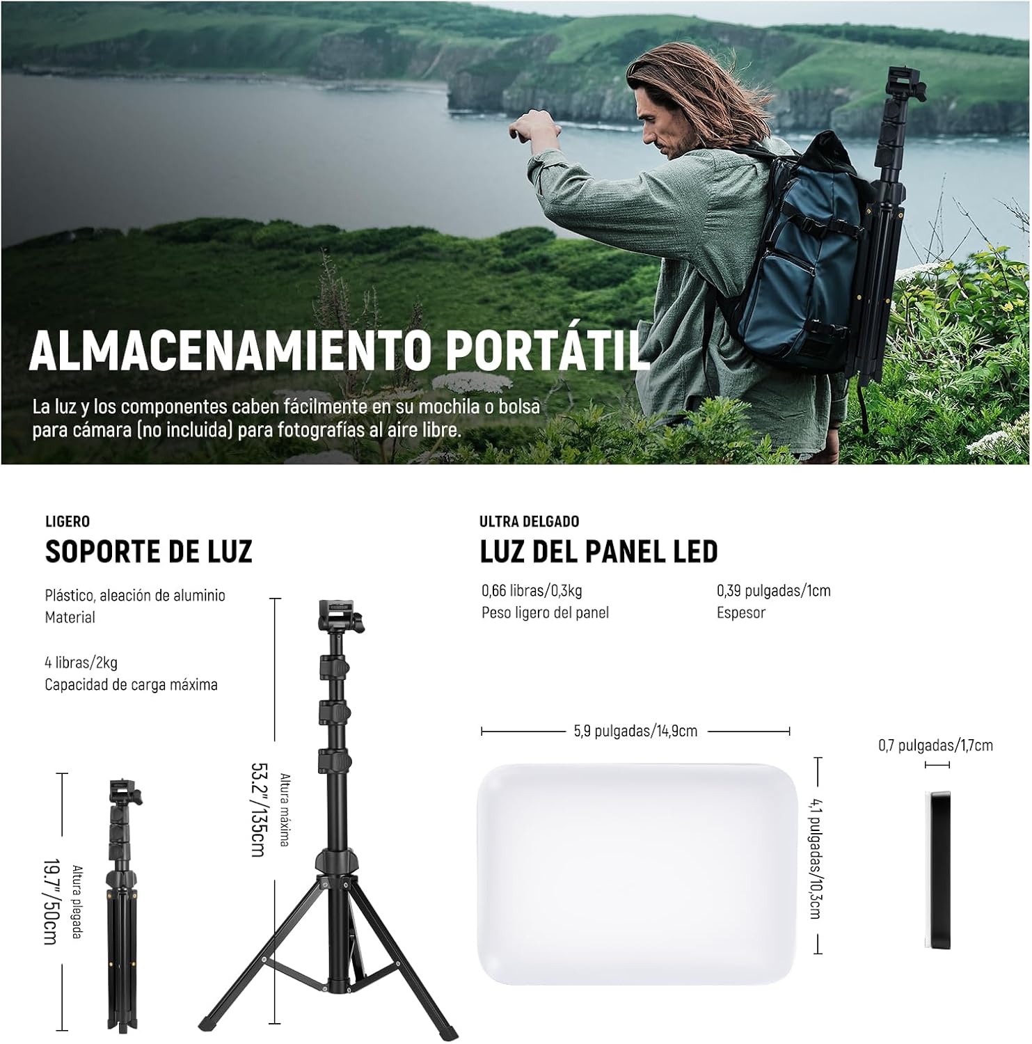 - 【Ajustable y Versátil】 Con una inclinación 180° hacia adelante y hacia atrás y una altura ajustable 19,7"/50cm a 53,2"/135cm, el soporte de luz del panel es ideal para capturar tomas aéreas, ascendentes y verticales. El soporte de luz también funciona como trípode de mesa o se pliega para usarlo como palo para selfies, y el tornillo superior de 1/4" es para montar la luz de video LED, el soporte para teléfono (no incluido) o el adaptador de cámara de acción (no incluido) para versatilidad.