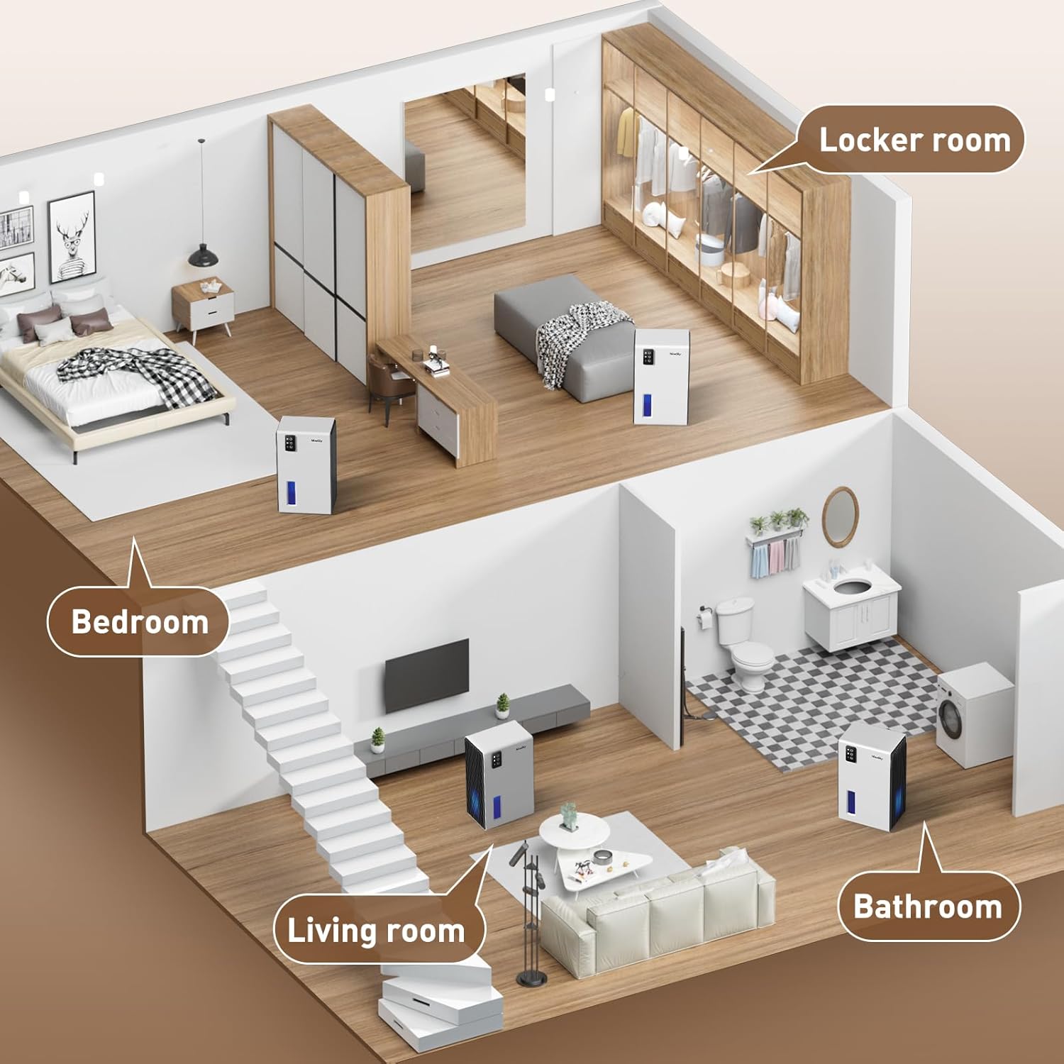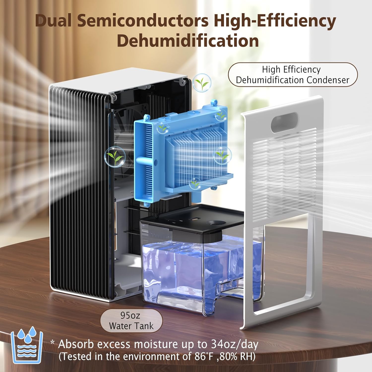 - Deshumidificador avanzado para el hogar: nuestro deshumidificador adopta tecnología de condensación de semiconductores con funcionamiento silencioso. Elimina eficazmente la humedad del aire para garantizar una vida cómoda.