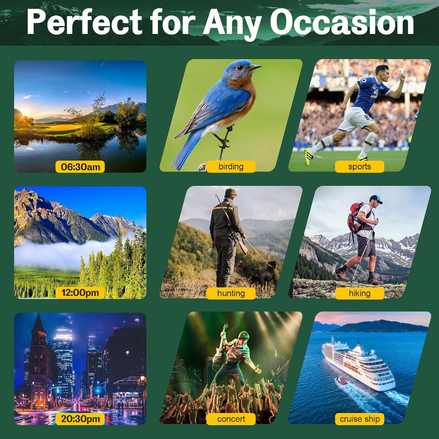- Prismáticos HD para observación de aves y más. Este binocular es perfecto para observar aves, ver conciertos, eventos deportivos y senderismo. Ya sea que estés en un campamento, crucero, viajando o viendo una ópera, estos son tus compañeros de viaje. No refleja la cáscara verde del ejército es su aliado discreto en la observación de aves, mezclándose con la naturaleza.
