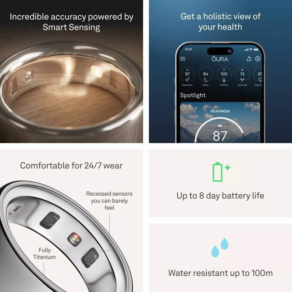 - BATERÍA DE LARGA DURACIÓN: Con hasta 8 días de batería, sin pantallas ni vibraciones, Oura Ring 4 te permite concentrarte en el presente. Desde un entrenamiento hasta una salida nocturna, puedes olvidarte de que lo llevas puesto. Hasta que empieces a recibir cumplidos.