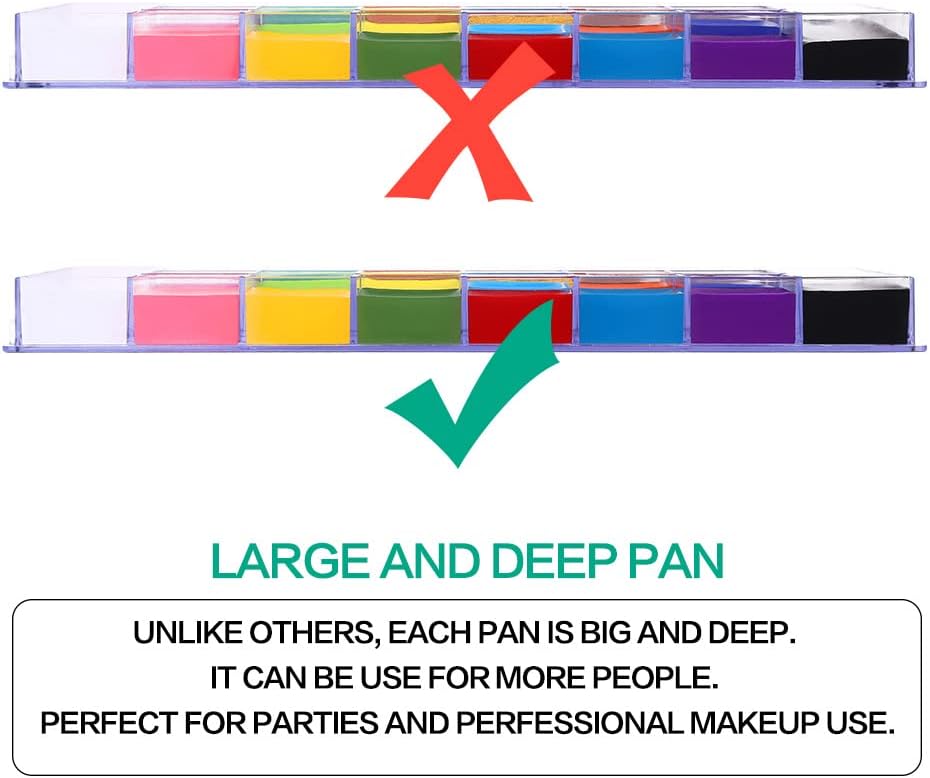 - Paleta de pintura a base de aceite no tóxica, la fórmula es húmeda, semisuave, segura y suave para la piel. Cobertura saturada de color más rica que el maquillaje ordinario, fácil de llevar y fácil de lavar con aceite de oliva o removedor de maquillaje profesional impermeable.