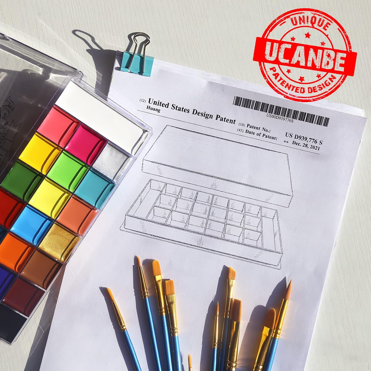 - Una paleta de pintura facial con 20 colores pigmentados intensos cremosos en una caja de plástico conveniente y resistente que se aplica fácilmente con esponja o cepillo. Se puede utilizar en la cara y el cuerpo.